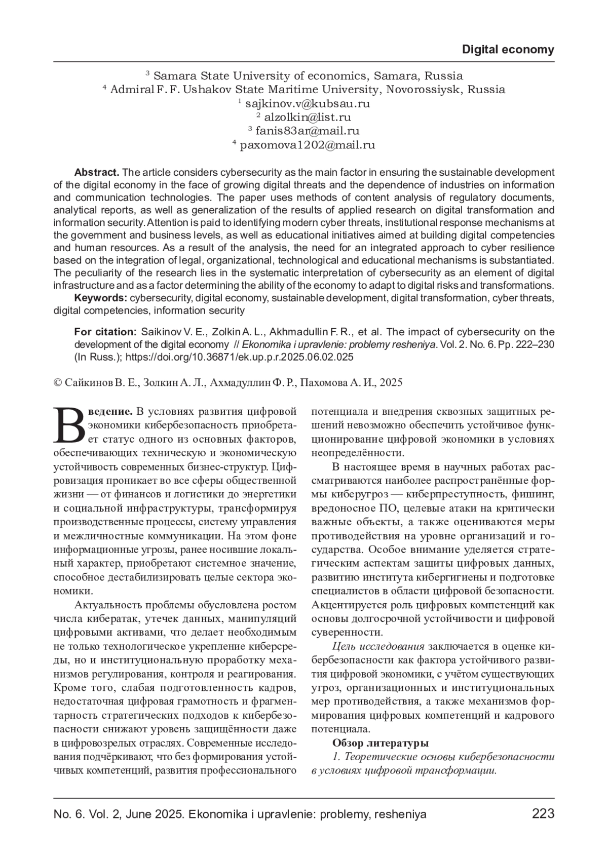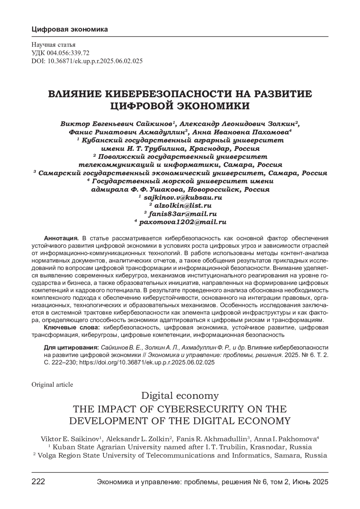 В статье рассматривается кибербезопасность как основной фактор обеспечения устойчивого развития цифровой экономики в условиях роста цифровых угроз и зависимости отраслей от информационно-коммуникационных технологий. В работе использованы методы контент- анализа нормативных документов, аналитических отчетов, а также обобщения результатов прикладных исследований по вопросам цифровой трансформации и информационной безопасности. Внимание уделяется выявлению современных киберугроз, механизмов институционального реагирования на уровне государства и бизнеса, а также образовательных инициатив, направленных на формирование цифровых компетенций и кадрового потенциала. В результате проведенного анализа обоснована необходимость комплексного подхода к обеспечению киберустойчивости, основанного на интеграции правовых, организационных, технологических и образовательных механизмов. Особенность исследования заключается в системной трактовке кибербезопасности как элемента цифровой инфраструктуры и как фактора, определяющего способность экономики адаптироваться к цифровым рискам и трансформациям.