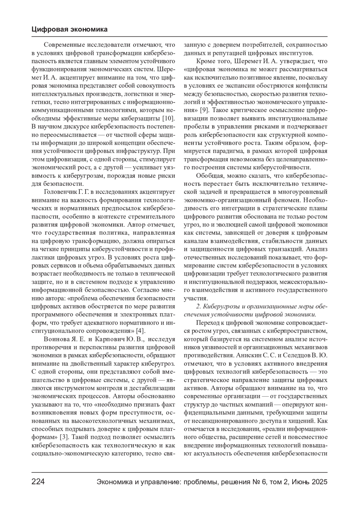4. Головенчик Г. Г. Проблемы кибербезопасности в условиях цифровой трансформации экономики и общества // Экономика. Управление. Инновации. - 2018. - № 2(4). - С. 23-33. EDN: FQTOMA