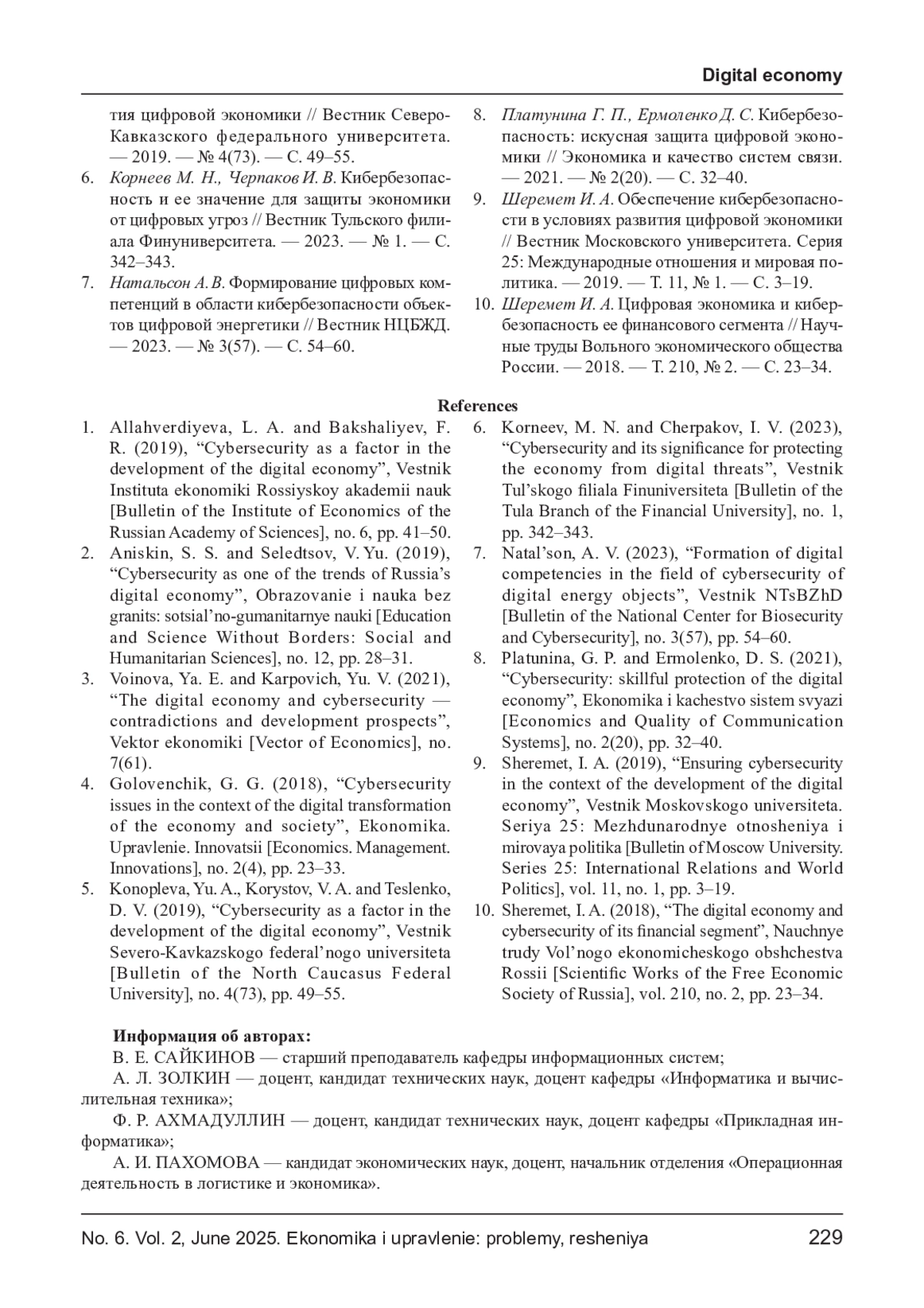 1. Аллахвердиева Л. А., Бахшалиев Ф. Р. Кибербезопасность как фактор развития цифровой экономики // Вестник Института экономики Российской академии наук. - 2019. - № 6.- С. 41-50. EDN: ZSVMQZ