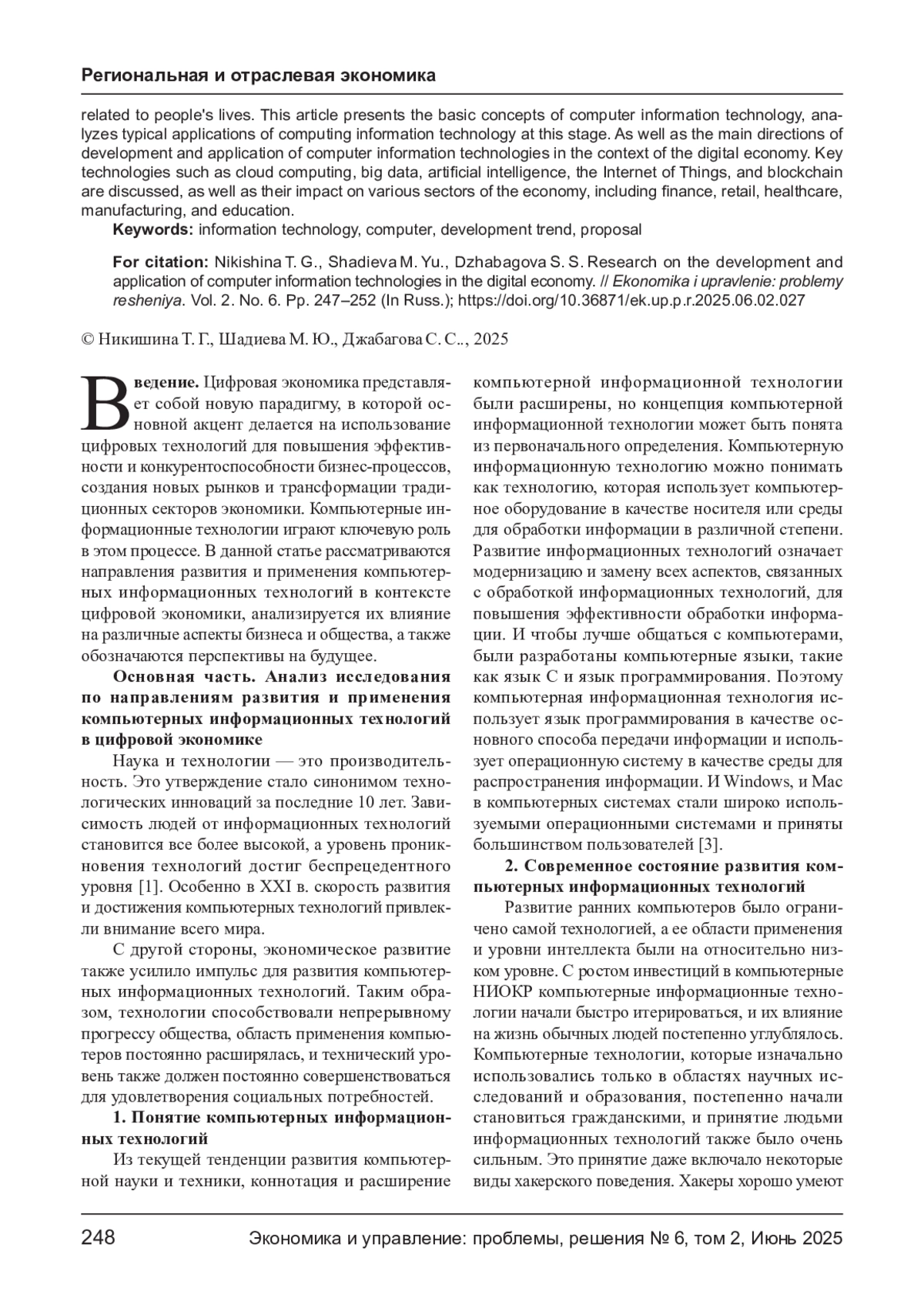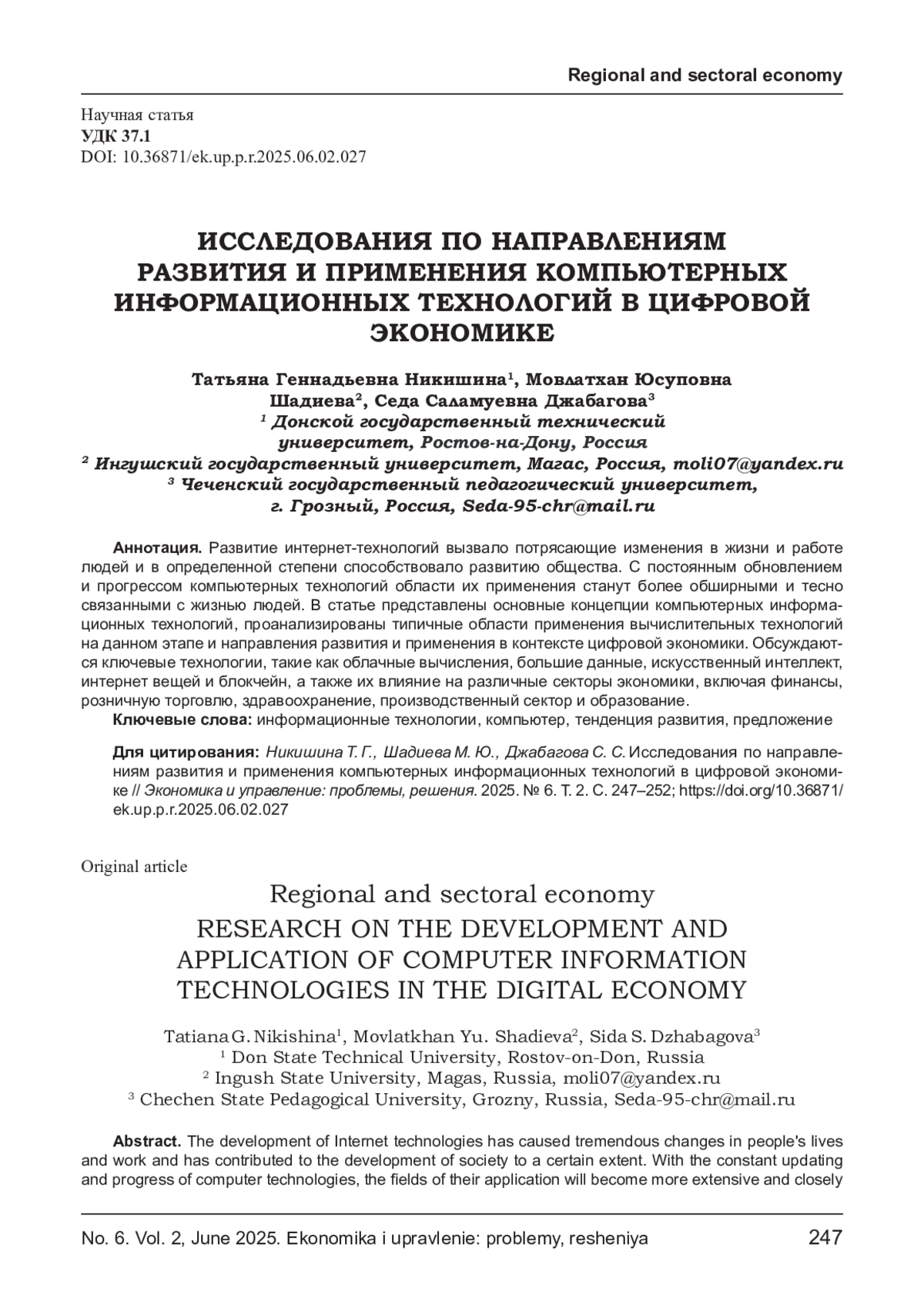 Развитие интернет-технологий вызвало потрясающие изменения в жизни и работе людей и в определенной степени способствовало развитию общества. С постоянным обновлением и прогрессом компьютерных технологий области их применения станут более обширными и тесно связанными с жизнью людей. В статье представлены основные концепции компьютерных информационных технологий, проанализированы типичные области применения вычислительных технологий на данном этапе и направления развития и применения в контексте цифровой экономики. Обсуждаются ключевые технологии, такие как облачные вычисления, большие данные, искусственный интеллект, интернет вещей и блокчейн, а также их влияние на различные секторы экономики, включая финансы, розничную торговлю, здравоохранение, производственный сектор и образование.