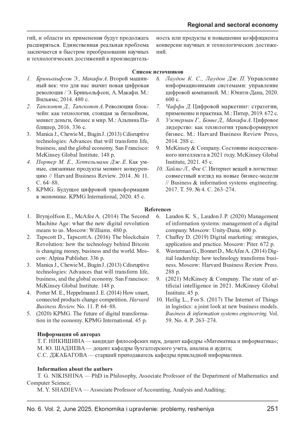 1. Бриньольфсон Э., Макафи А. Второй машинный век: что для нас значит новая цифровая революция / Э. Бриньольфсон, А. Макафи. М.: Вильямс, 2014. 480 с.