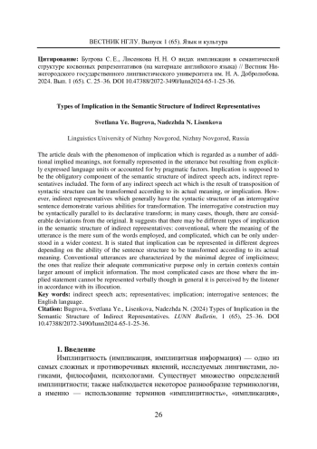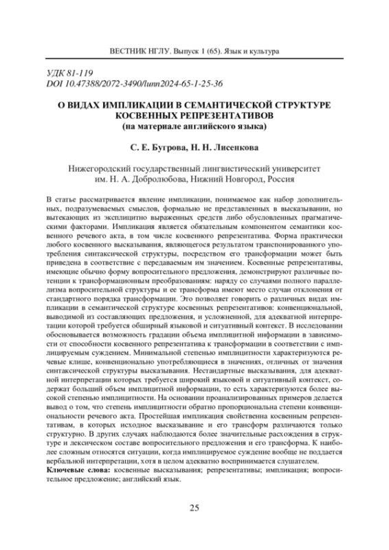 В статье рассматривается явление импликации, понимаемое как набор дополнительных, подразумеваемых смыслов, формально не представленных в высказывании, но вытекающих из эксплицитно выраженных средств либо обусловленных прагматическими факторами. Импликация является обязательным компонентом семантики косвенного речевого акта, в том числе косвенного репрезентатива. Форма практически любого косвенного высказывания, являющегося результатом транспонированного употребления синтаксической структуры, посредством его трансформации может быть приведена в соответствие с передаваемым им значением. Косвенные репрезентативы, имеющие обычно форму вопросительного предложения, демонстрируют различные потенции к трансформационным преобразованиям: наряду со случаями полного параллелизма вопросительной структуры и ее трансформа имеют место случаи отклонения от стандартного порядка трансформации. Это позволяет говорить о различных видах импликации в семантической структуре косвенных репрезентативов: конвенциональной, выводимой из составляющих предложения, и усложненной, для адекватной интерпретации которой требуется обширный языковой и ситуативный контекст. В исследовании обосновывается возможность градации объема имплицитной информации в зависимости от способности косвенного репрезентатива к трансформации в соответствии с имплицируемым суждением. Минимальной степенью имплицитности характеризуются речевые клише, конвенционально употребляющиеся в значениях, отличных от значения синтаксической структуры высказывания. Нестандартные высказывания, для адекватной интерпретации которых требуется широкий языковой и ситуативный контекст, содержат больший объем имплицитной информации, то есть характеризуются более высокой степенью имплицитности. На основании проанализированных примеров делается вывод о том, что степень имплицитности обратно пропорциональна степени конвенциональности речевого акта. Простейшая импликация свойственна косвенным репрезентативам, в которых исходное высказывание и его трансформ различаются только структурно. В других случаях наблюдаются более значительные расхождения в структуре и лексическом составе вопросительного предложения и его трансформа. К наиболее сложным относятся ситуации, когда имплицируемое суждение вообще не поддается вербальной интерпретации, хотя в целом адекватно воспринимается слушателем.