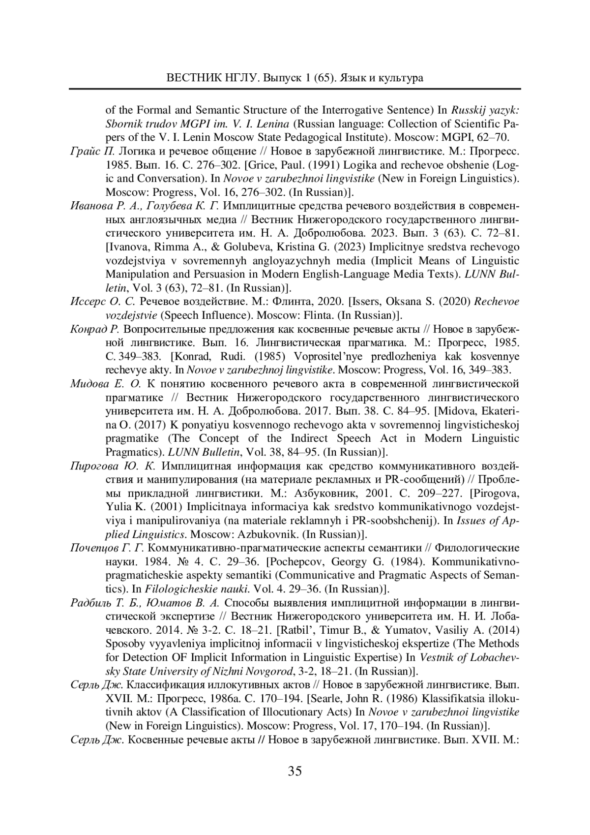 10. Иванова Р. А., Голубева К. Г. Имплицитные средства речевого воздействия в современных англоязычных медиа // Вестник Нижегородского государственного лингвистического университета им. Н. А. Добролюбова. 2023. Вып. 3 (63). С. 72-81. EDN: BQFZHU