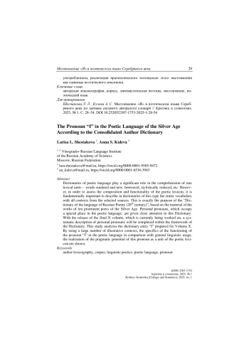 Словари языка поэзии играют значимую роль в истолковании и осмыслении редких лексических единиц – устаревших и новых слов, заимствованных, стилистически сниженных и др. Однако для оценки состава и функциональности поэтического лексикона принципиально важно описывать в словарях этого типа всю лексику с приведением всех контекстов из выбранных источников. Именно такой является целеустановка «Словаря языка русской поэзии ХХ века», основанного на материале произведений десяти видных поэтов Серебряного века. Личным местоимениям, занимающим в поэтическом языке особое место, в Словаре уделяется пристальное внимание. С выходом итогового X тома, над которым сейчас ведется работа, будет завершено, в рамках Словаря, системное описание личных местоимений. В настоящем исследовании анализируется подготовленная для X тома словарная статья Я. Показаны, с привлечением большого числа иллюстративных контекстов, специфика функционирования местоимения я в поэтическом языке в сопоставлении с общеязыковым употреблением, реализация прагматического потенциала этого местоимения как единицы поэтического лексикона.