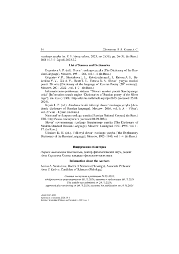Данное исследование строится на материалах «Словаря языка русской поэзии ХХ века» (СЯРП), создаваемого в Институте русского языка им. В. В. Виноградова РАН и реализующего идеи В. П. Григорьева в об-ласти поэтической лексикографии [Григорьев, 1973; 1979]. СЯРП носит сводный характер, представляет поэтический язык Серебряного века по стихотворным произведениям десяти видных авторов: И. Анненского, А. Ахматовой, А. Блока, С. Есенина, М. Кузмина, О. Мандельштама, В. Мая- ковского, Б. Пастернака, В. Хлебникова, М. Цветаевой.