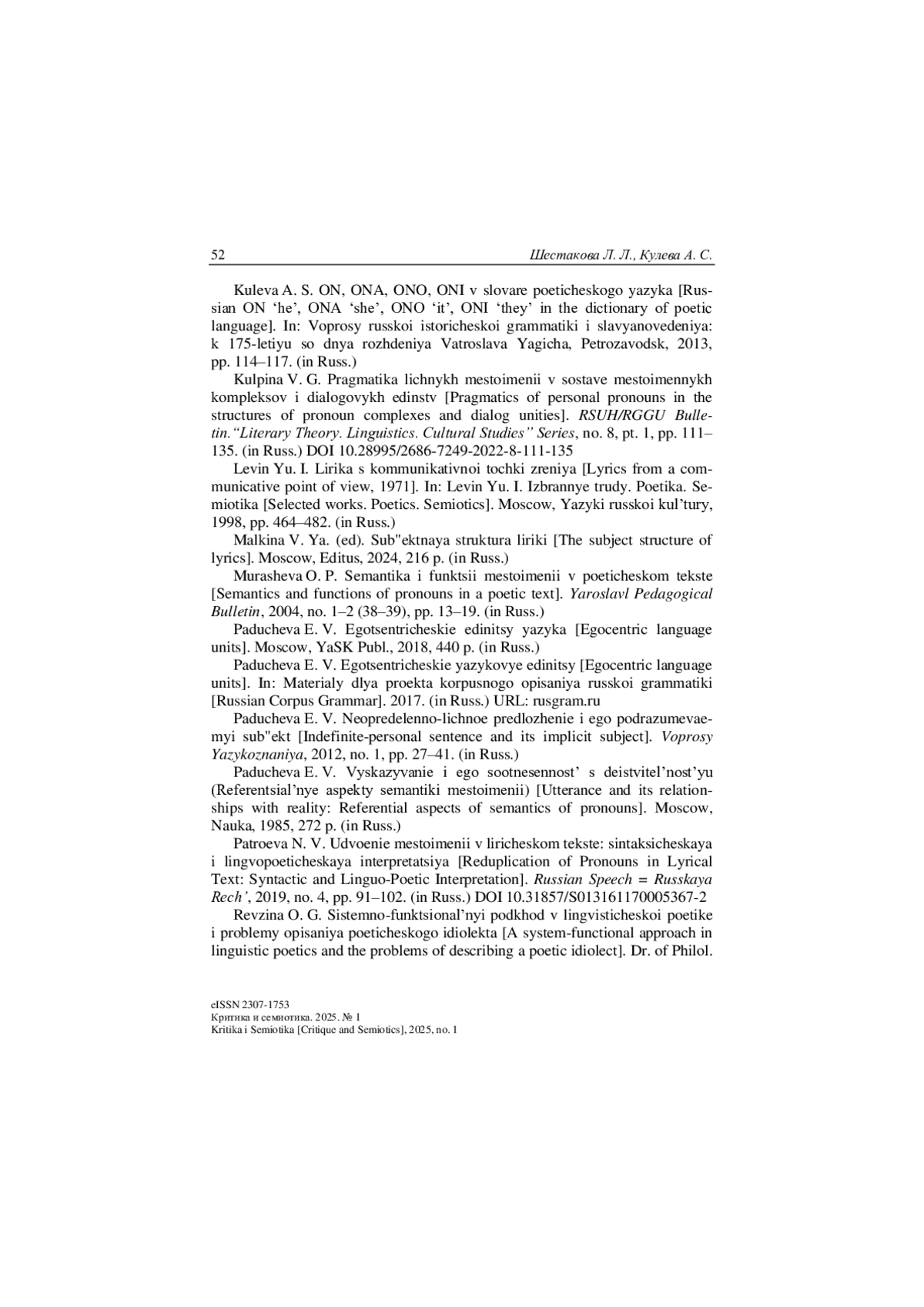 23. Кульпина В. Г. Прагматика личных местоимений в составе местоименных комплексов и диалоговых единств // Вестник РГГУ. Серия: Литературоведение. Языкознание. Культурология. 2022. № 8(1). С. 111-135. DOI: 10.28995/2686-7249-2022-8-111-135
