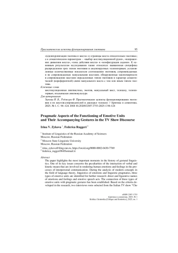 Освещаются наиболее важные моменты в истории становления жестикуляционной лингвистики, центральное место в которой занимает вопрос о специфике взаимодействия вербальных и кинетических средств передачи эмоций и чувств человека в процессе межличностного общения. С опорой на современные концепции в области теории языка, лингвистики эмоций и лингвопрагматики для исследования выделяются три типа эмотивов: прямые и образные номинации эмоций и чувств и эмотивные речевые акты. Обосновывается связь данных типов эмотивов с прагматическими жестами. С помощью выработанных в исследовании критериев отбираются два телеинтервью из одного выпуска итальянского телешоу «Che tempo che fa» общей продолжительностью 35 минут. Применяемая комплексная методика, включающая этапы разметки и глубокого аннотирования материала, позволила установить наиболее релевантные формальные и семантические параметры взаимодействия эмотивов и мануальных жестов у участников ток-шоу. К числу формальных относятся параметры «(а)синхронизация эмотива и жеста» и «границы жеста относительно эмотива»; а к семантическим параметрам – «выбор жестикуляционной руки», «направление движения жеста», «зона действия жеста» и «конфигурация ладони». К основным результатам исследования также относятся: выявленная специфика распределения трех типов эмотивов в анализируемых телеинтервью; установ-ленные количественные показатели соотношения эмотивов, сопровождаемых и не сопровождаемых мануальными жестами; обнаруженные закономерности в сопровождении жестами определенных типов эмотивов и характер семантической (кореферентной) связи мануального жеста с тем или иным типом эмотива.
