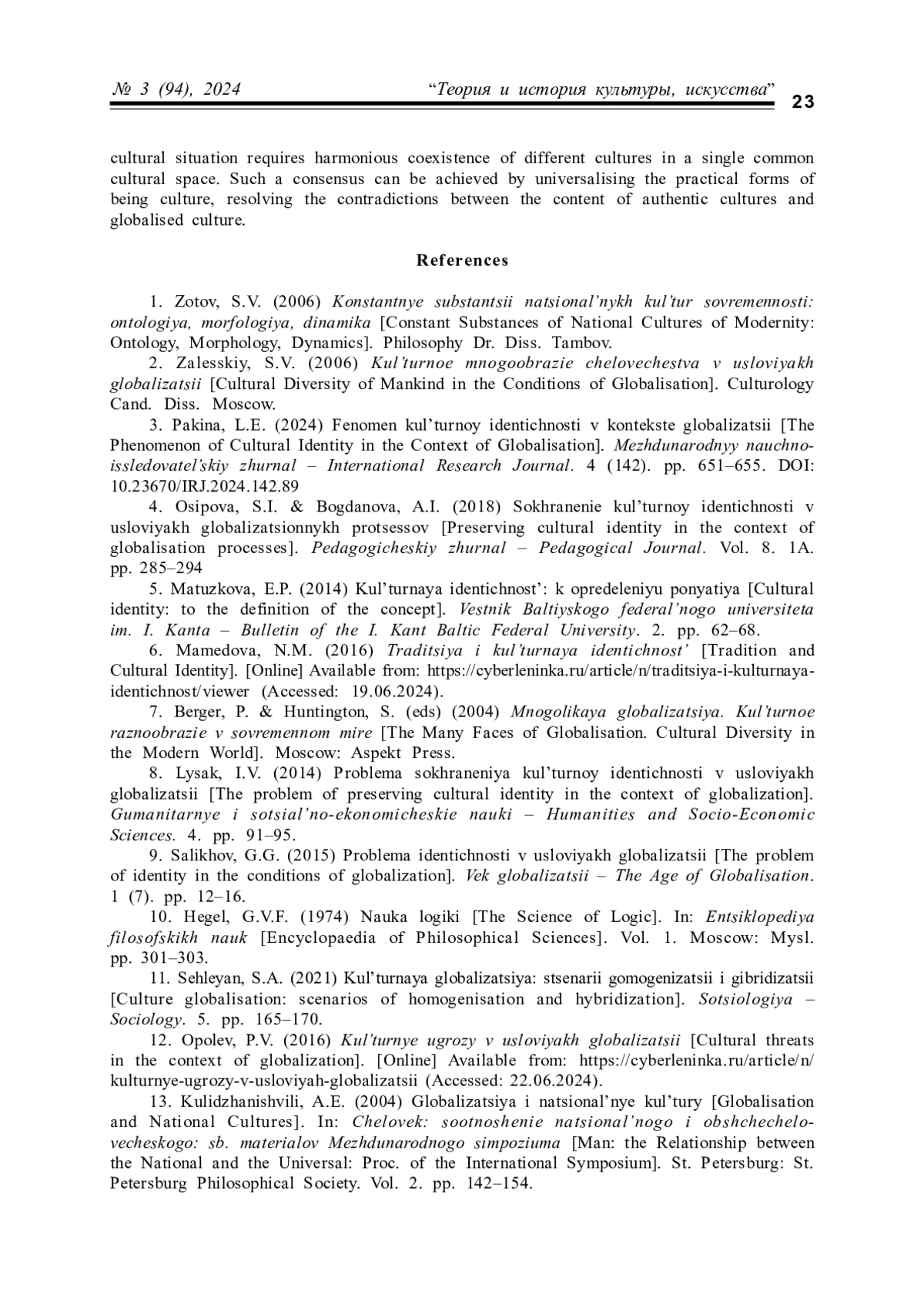 3. Пакина Л. Е. Феномен культурной идентичности в контексте глобализации // Международный научно-исследовательский журнал. 2024. № 4. С. 651-655. EDN: JYJHZB