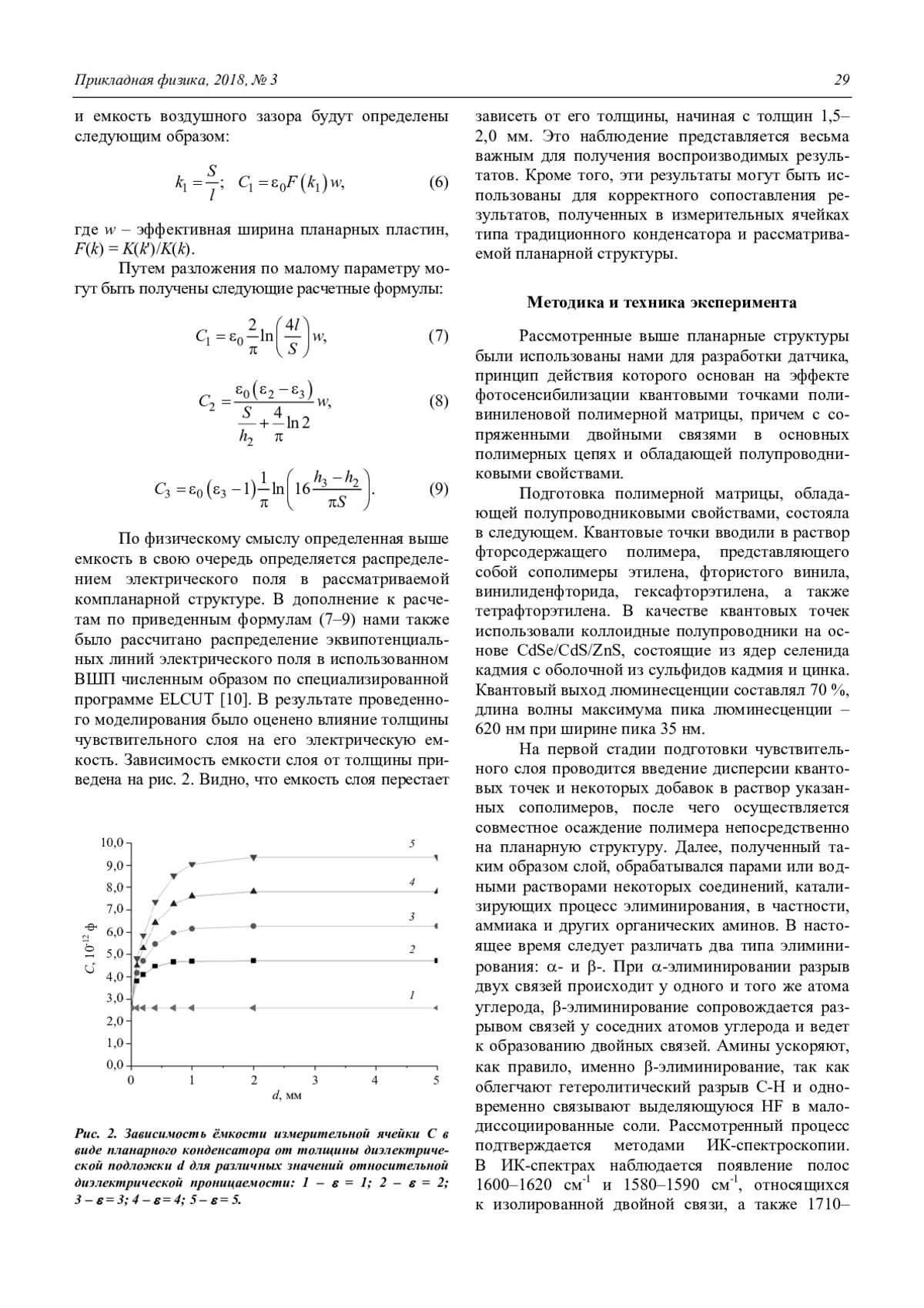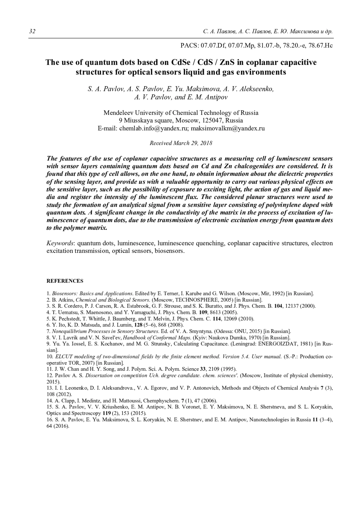 The use of quantum dots based on CdSe / CdS / ZnS in coplanar capacitive structures for optical sensors liquid and gas environments S. A. Pavlov, A. S. Pavlov, E. Yu. Maksimova, A. V. Alekseenko, A. V. Pavlov, and E. M. Antipov 27