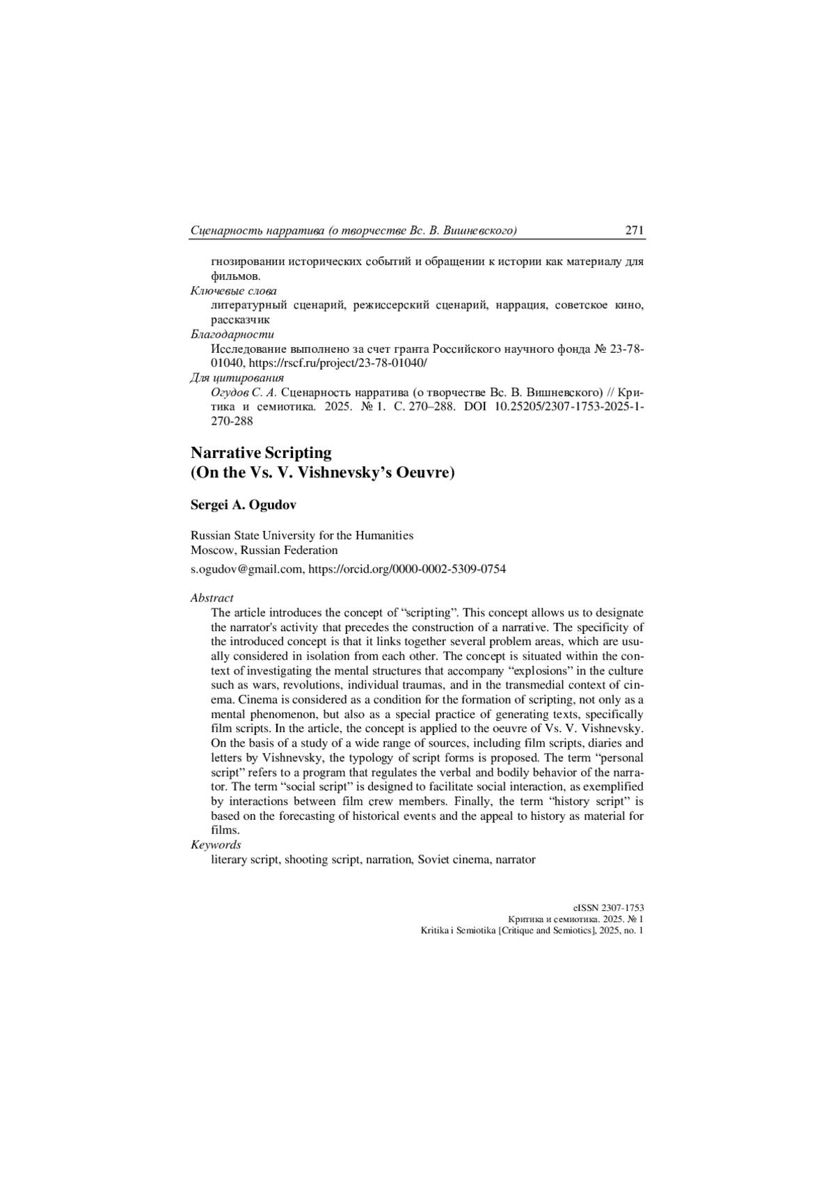 ОГУДОВ С. А. СЦЕНАРНОСТЬ НАРРАТИВА (О ТВОРЧЕСТВЕ ВС. В. ВИШНЕВСКОГО) // КРИТИКА И СЕМИОТИКА. 2025. № 1