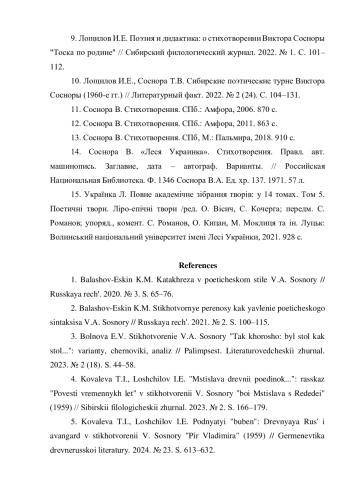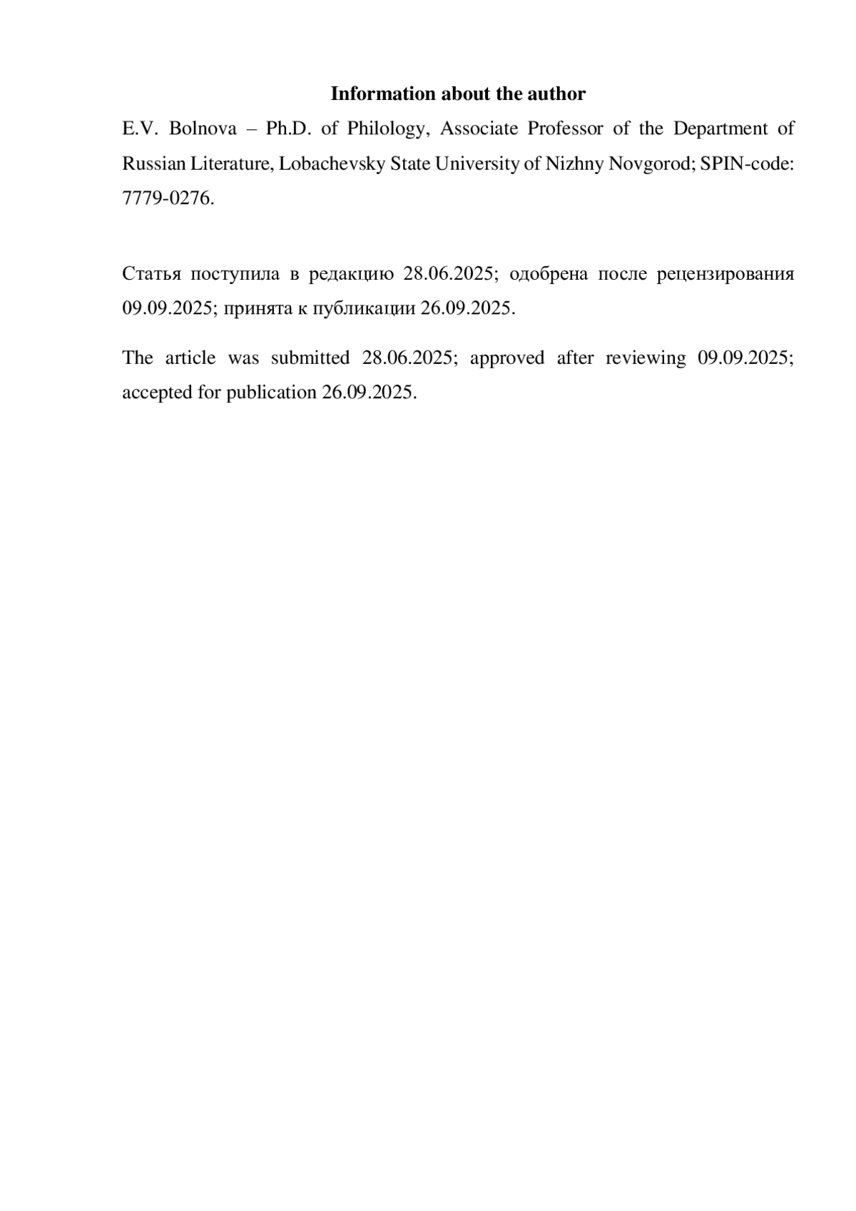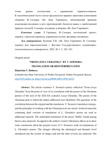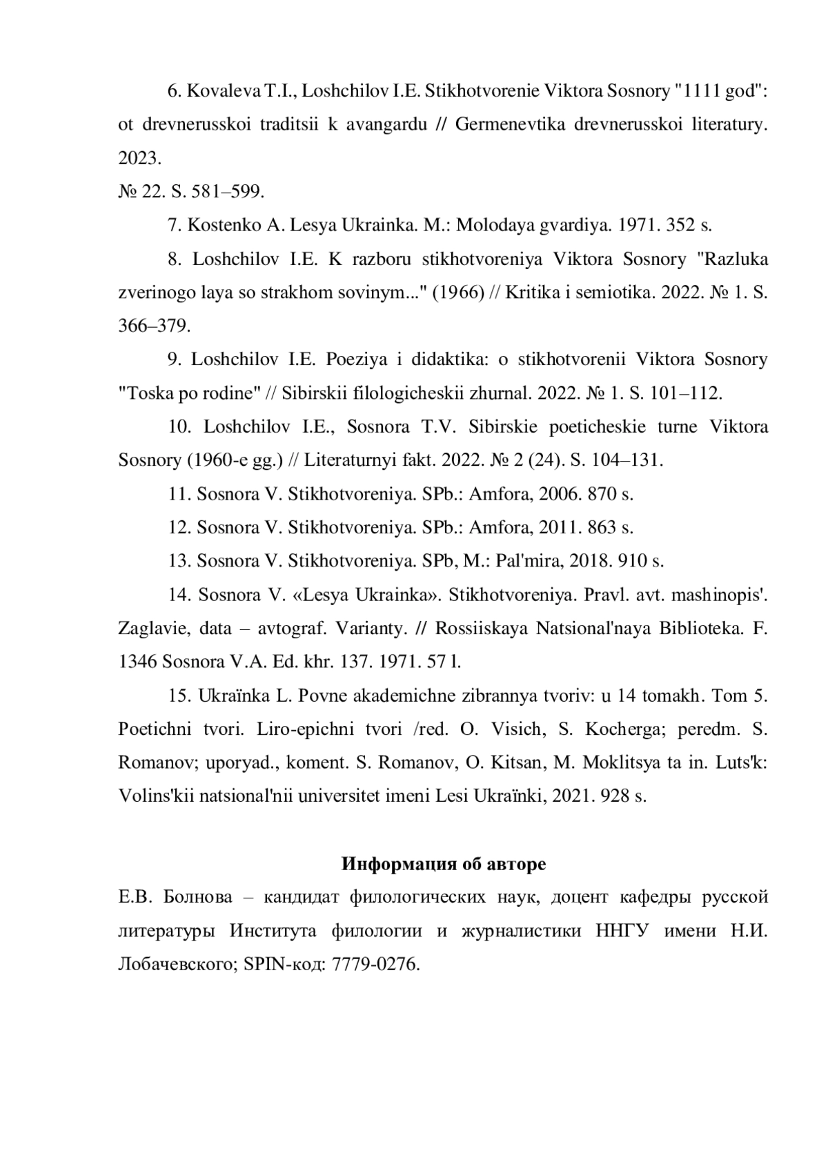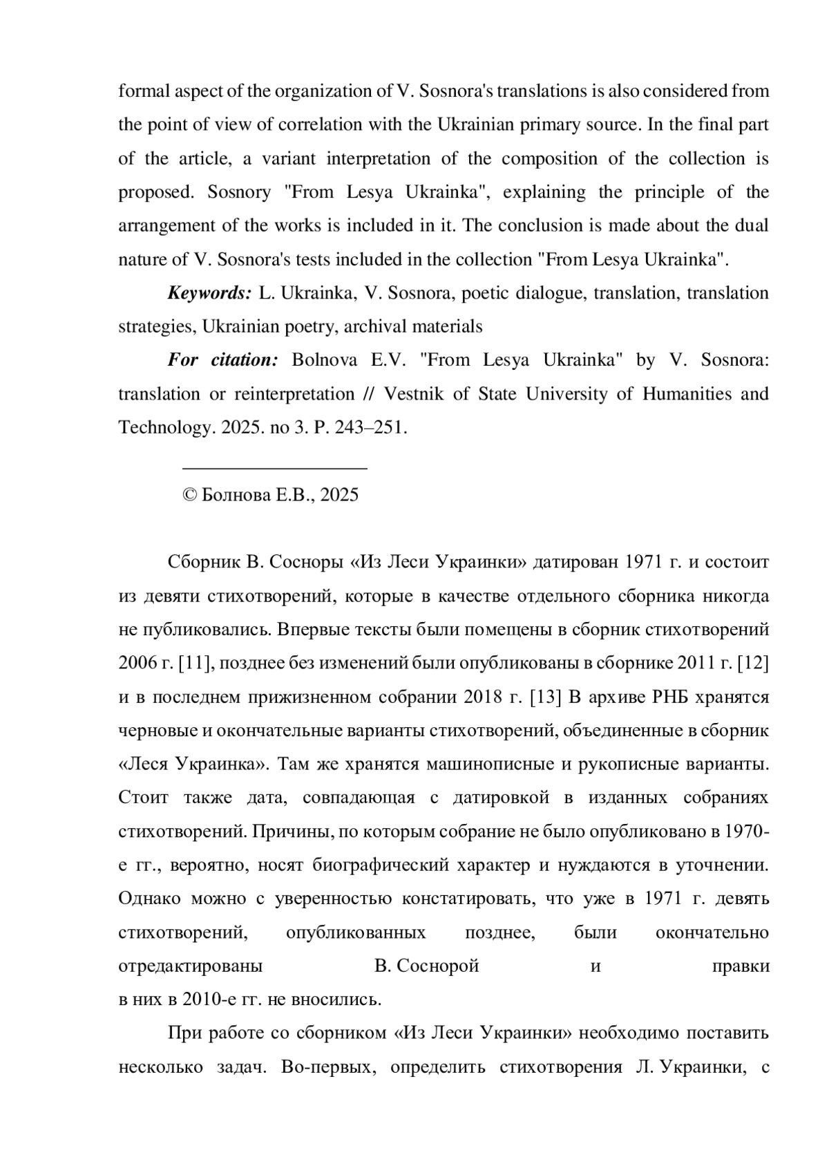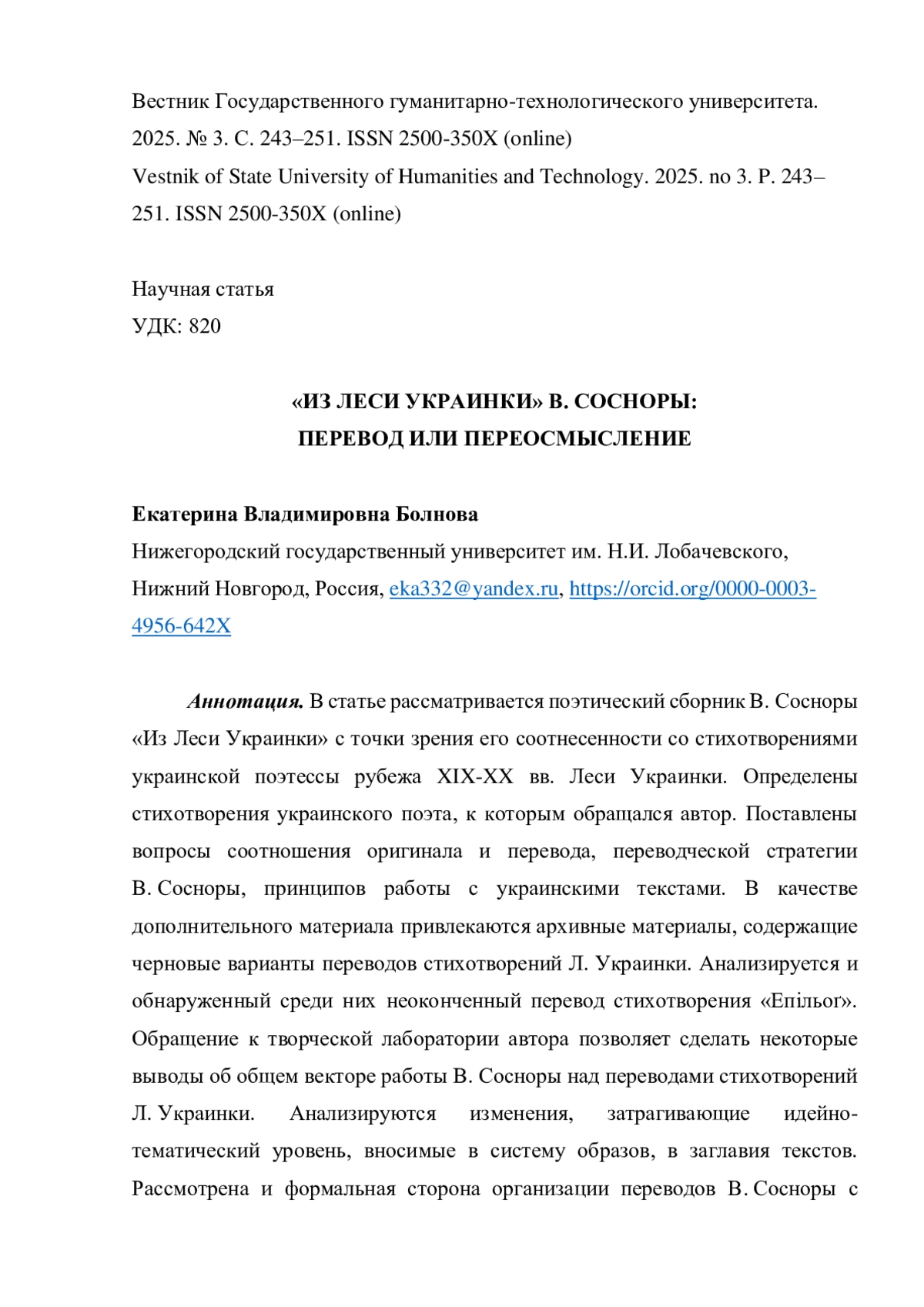 БОЛНОВА Е. В. «ИЗ ЛЕСИ УКРАИНКИ» В. СОСНОРЫ: ПЕРЕВОД ИЛИ ПЕРЕОСМЫСЛЕНИЕ // ВЕСТНИК ГОСУДАРСТВЕННОГО ГУМАНИТАРНО-ТЕХНОЛОГИЧЕСКОГО УНИВЕРСИТЕТА. 2025. № 3