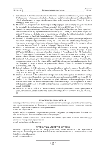 10. Мурзалин Б. Б., Ибрагимов В. Н. Психолого-педагогические особенности подготовки школьников к олимпиадам // Молодой учёный. 2021. №43 (385). С. 270-271. EDN: WWCDNH