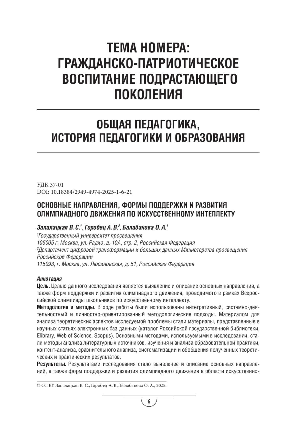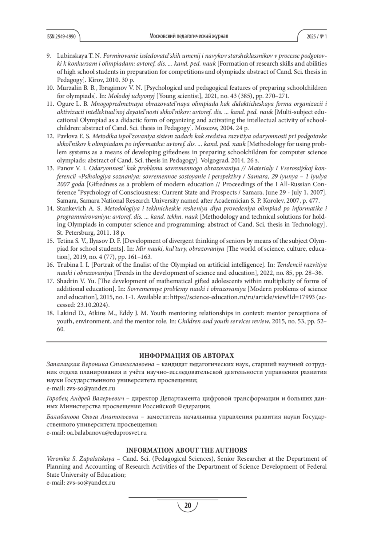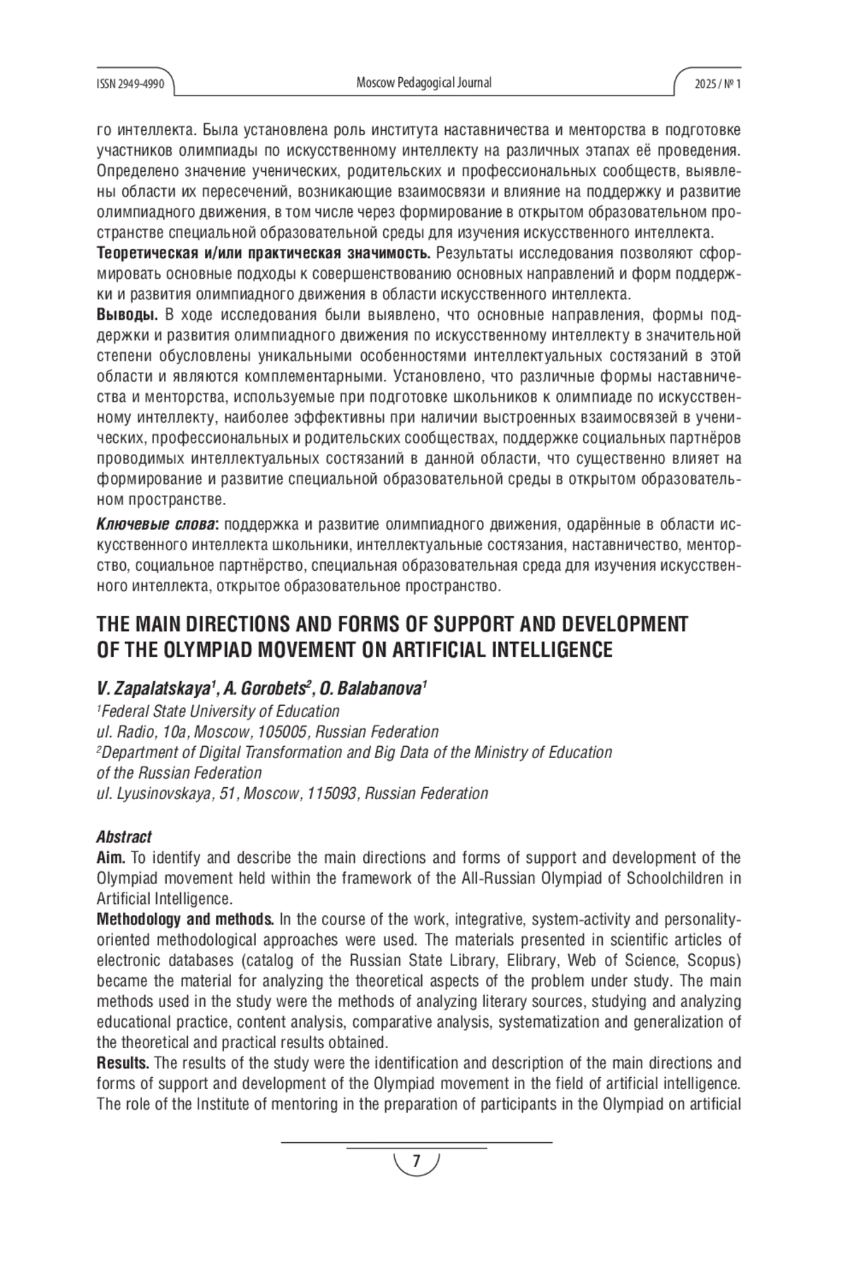 5. Запалацкая В. С., Балабанова О. А. Особенности обучения школьников, одарённых в области искусственного интеллекта // Московский педагогический журнал. 2024. №4. С. EDN: CTPVGG
