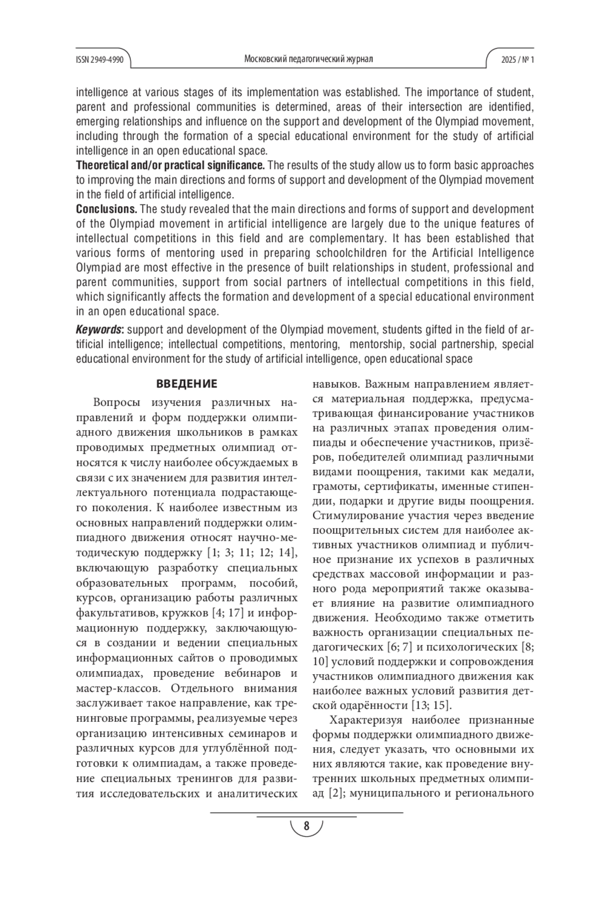 Выводы. В ходе исследования были выявлено, что основные направления, формы поддержки и развития олимпиадного движения по искусственному интеллекту в значительной степени обусловлены уникальными особенностями интеллектуальных состязаний в этой области и являются комплементарными. Установлено, что различные формы наставничества и менторства, используемые при подготовке школьников к олимпиаде по искусственному интеллекту, наиболее эффективны при наличии выстроенных взаимосвязей в ученических, профессиональных и родительских сообществах, поддержке социальных партнёров проводимых интеллектуальных состязаний в данной области, что существенно влияет на формирование и развитие специальной образовательной среды в открытом образовательном пространстве.