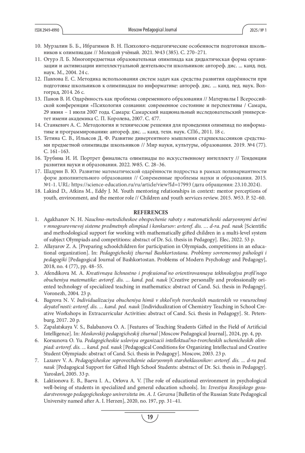 1. Агаханов Н. Х. Научно-методическое обеспечение работы с математически одарёнными детьми в многоуровневой системе предметных олимпиад и конкурсов: автореф. дис.... д-ра. пед. наук. Елец, 2022. 53 с.