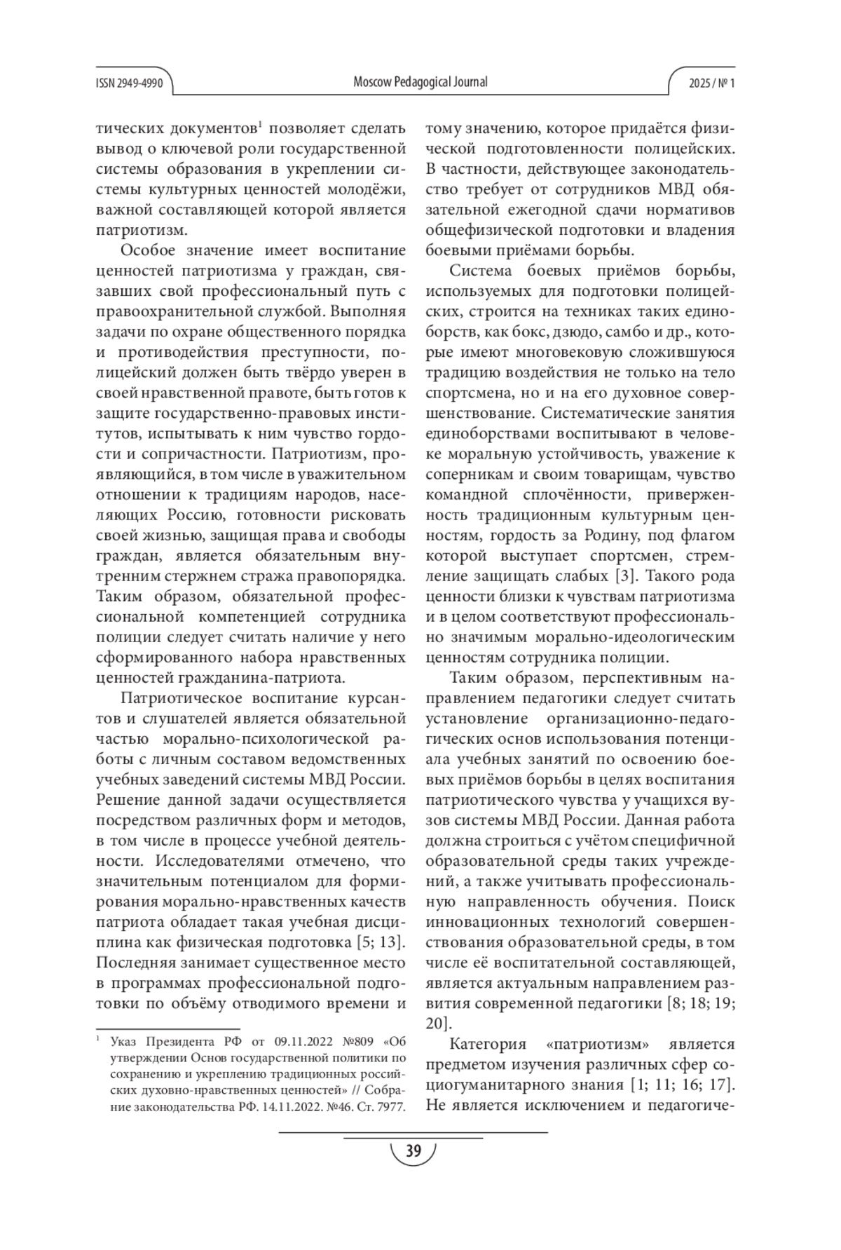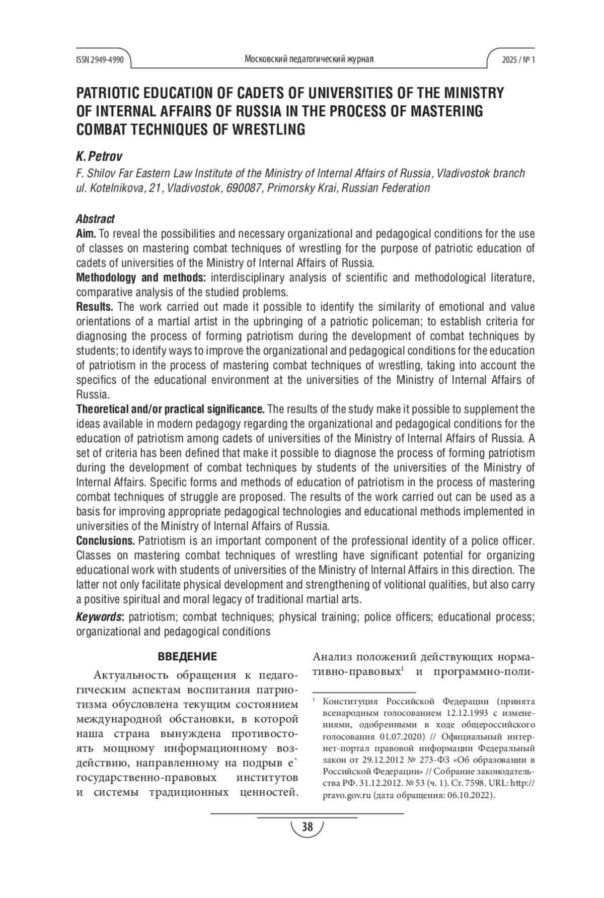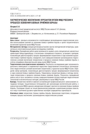 Выводы. Патриотизм является важной составляющей профессионального самосознания сотрудника полиции. Существенным потенциалом для организации воспитательной работы с курсантами вузов МВД в данном направлении обладают занятия по освоению боевых приёмов борьбы. Последние служат не только физическому развитию и укреплению волевых качеств, но и несут позитивное духовно-нравственное наследие традиционных единоборств.