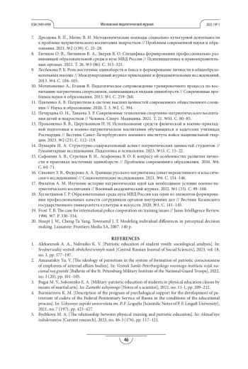 1. Алексеенок А. А., Наливайко К. В. Патриотическое воспитание студенческой молодёжи: социологический анализ // Среднерусский вестник общественных наук. 2023. Т. 18. №3. С. 177-197. EDN: YILWEN