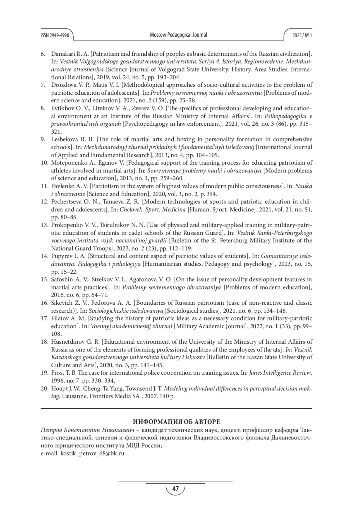 13. Прокопенко В. В., Цирульников Н. Н. Использование средств физической и военно-прикладной подготовки в военно-патриотическом воспитании обучающихся в кадетских училищах Росгвардии // Вестник Санкт-Петербургского военного института войск национальной гвардии. 2023. №2 (23). С. 112-119. EDN: AXSYPG