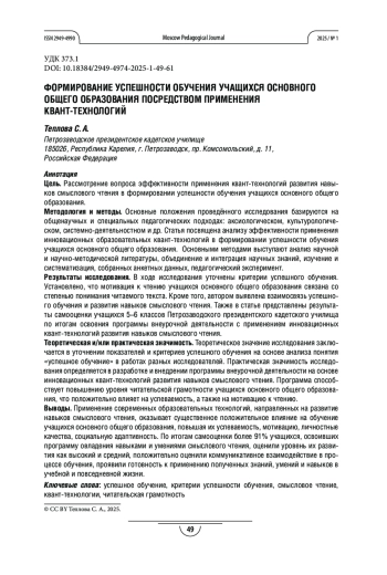 Методология и методы. Основные положения проведённого исследования базируются на общенаучных и специальных педагогических подходах: аксиологическом, культурологическом, системно-деятельностном и др. Статья посвящена анализу эффективности применения инновационных образовательных квант-технологий в формировании успешности обучения учащихся основного общего образования. Основными методами выступают анализ научной и научно-методической литературы, объединение и интеграция научных знаний, изучение и систематизация, собранных анкетных данных, педагогический эксперимент.