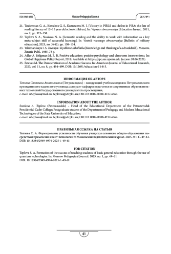 22. Теплова С. А., Носкова Н. А. Смысловое чтение и умение работать с информацией как ключевое метапредметное умение успешного обучения // Вестник военного образования. 2023.№3 (42). С. 130-134. EDN: XGHPHR