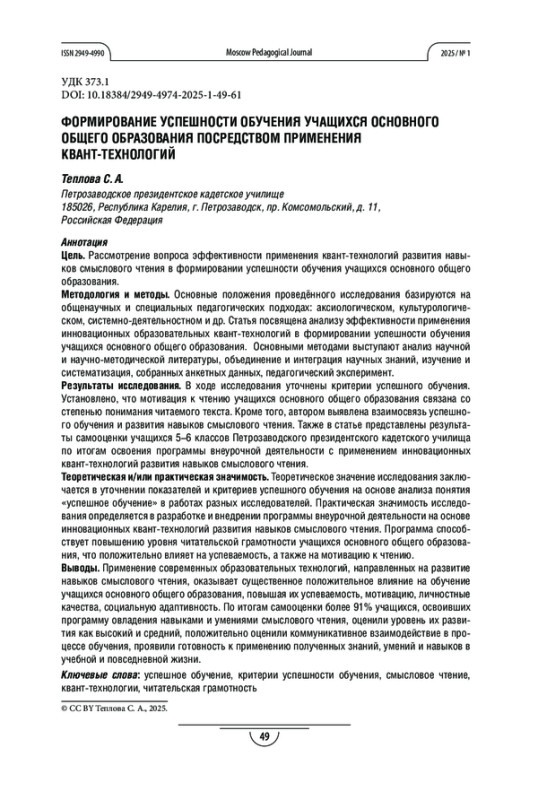 Цель. Рассмотрение вопроса эффективности применения квант-технологий развития навыков смыслового чтения в формировании успешности обучения учащихся основного общего образования.
