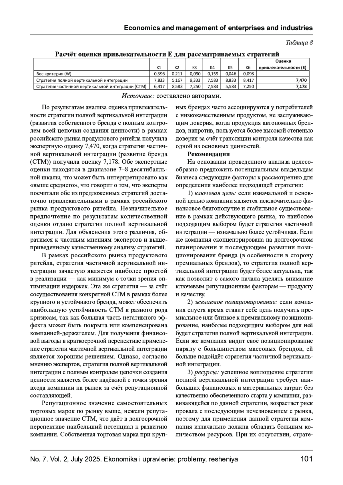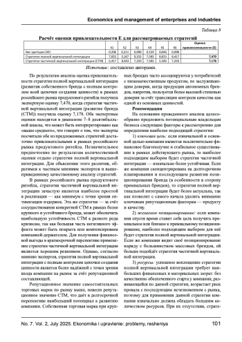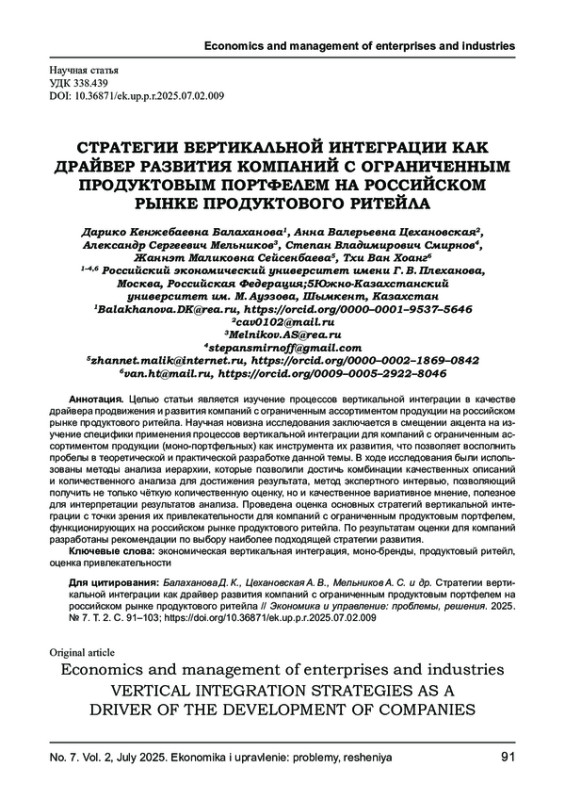 Целью статьи является изучение процессов вертикальной интеграции в качестве драйвера продвижения и развития компаний с ограниченным ассортиментом продукции на российском рынке продуктового ритейла. Научная новизна исследования заключается в смещении акцента на изучение специфики применения процессов вертикальной интеграции для компаний с ограниченным ассортиментом продукции (моно-портфельных) как инструмента их развития, что позволяет восполнить пробелы в теоретической и практической разработке данной темы. В ходе исследования были использованы методы анализа иерархии, которые позволили достичь комбинации качественных описаний и количественного анализа для достижения результата, метод экспертного интервью, позволяющий получить не только чёткую количественную оценку, но и качественное вариативное мнение, полезное для интерпретации результатов анализа. Проведена оценка основных стратегий вертикальной интеграции с точки зрения их привлекательности для компаний с ограниченным продуктовым портфелем, функционирующих на российском рынке продуктового ритейла. По результатам оценки для компаний разработаны рекомендации по выбору наиболее подходящей стратегии развития.