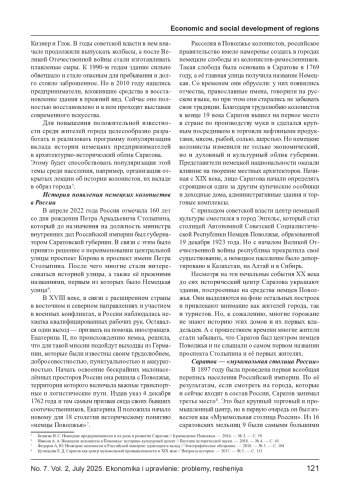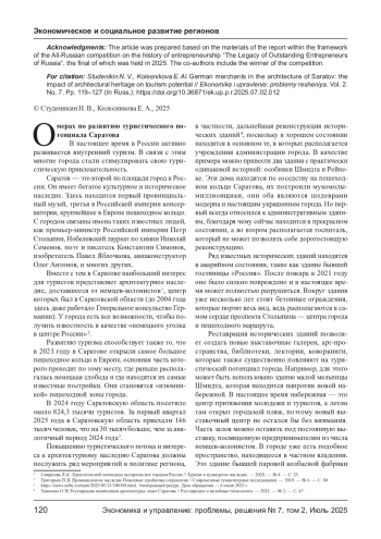 СТУДЕНИКИН Н. В., КОЛЕСНИКОВА Е. А. ТРАДИЦИИ СОЦИАЛЬНОЙ ОТВЕТСТВЕННОСТИ НЕМЕЦКОГО КУПЕЧЕСТВА САРАТОВА: ВЛИЯНИЕ АРХИТЕКТУРНОГО НАСЛЕДИЯ НА ТУРИСТИЧЕСКИЙ ПОТЕНЦИАЛ // ЭКОНОМИКА И УПРАВЛЕНИЕ: ПРОБЛЕМЫ, РЕШЕНИЯ. 2025. ТОМ 2 № 7