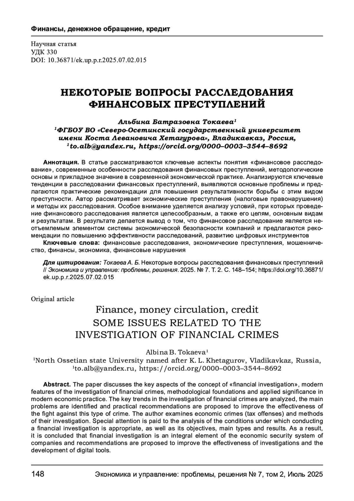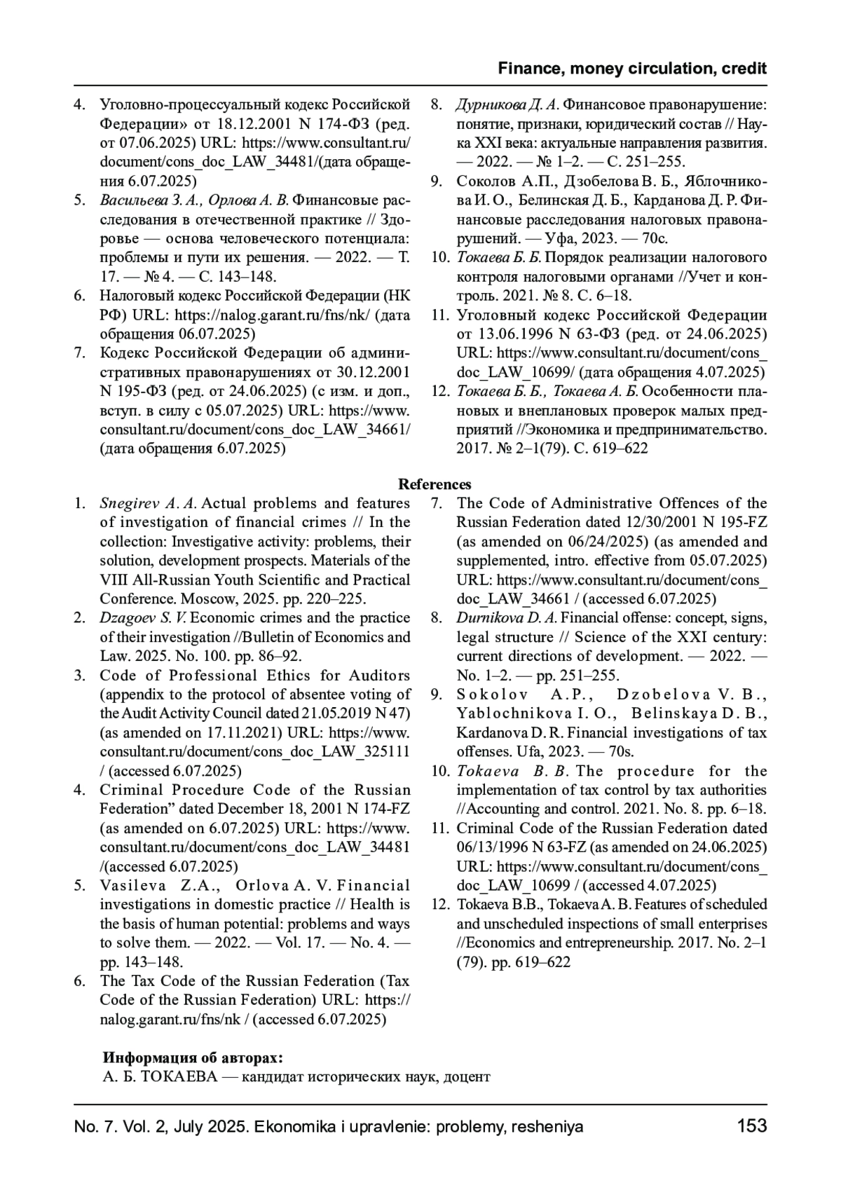2. Дзагоев С. В. Экономические преступления и практика их расследования //Вестник экономики и права. 2025. № 100. С. 86-92. EDN: BIWAZU