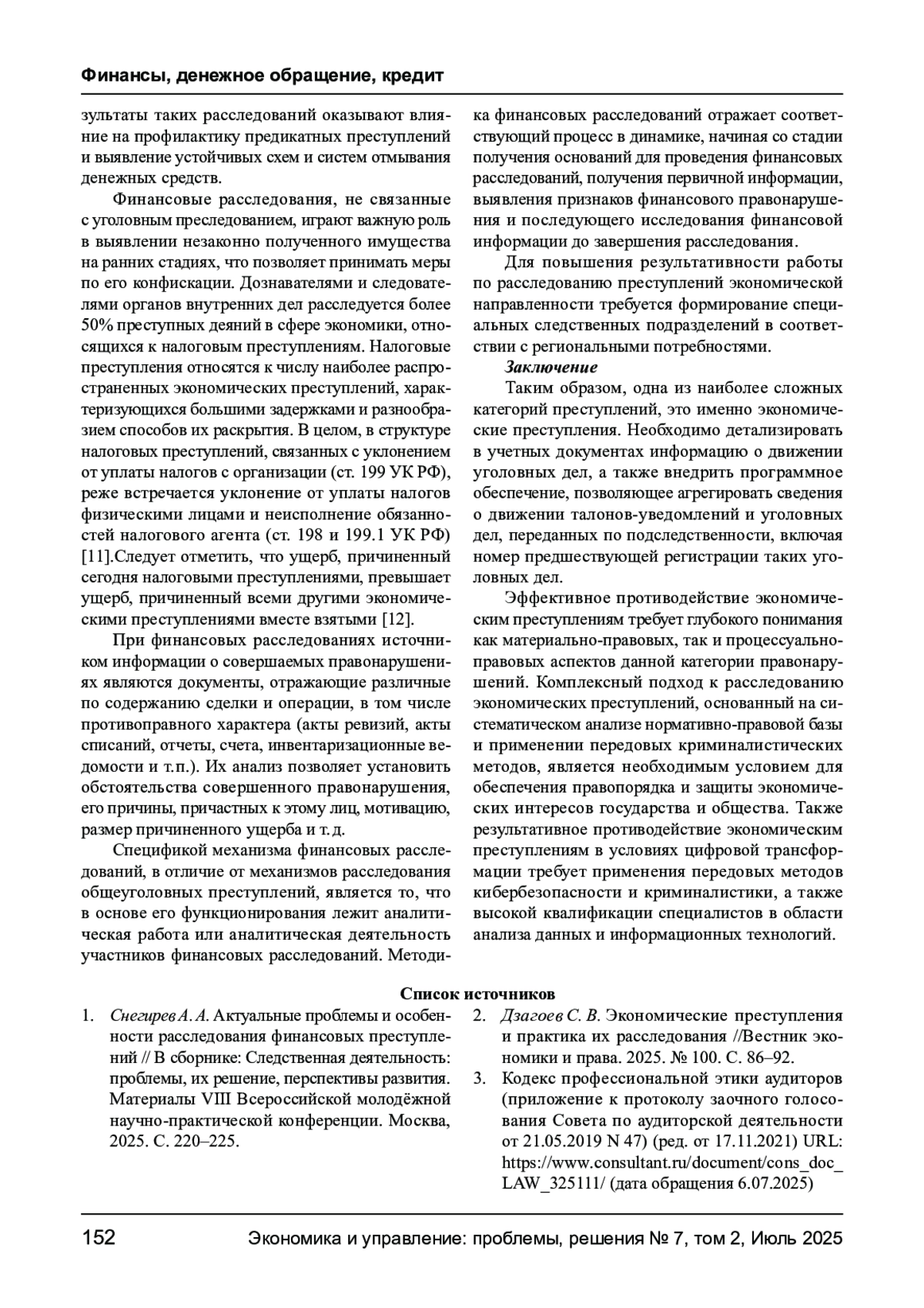 1. Снегирев А. А. Актуальные проблемы и особенности расследования финансовых преступлений // В сборнике: Следственная деятельность: проблемы, их решение, перспективы развития. Материалы VIII Всероссийской молодёжной научно-практической конференции. Москва,2025. С. 220-225. EDN: VUDSNO
