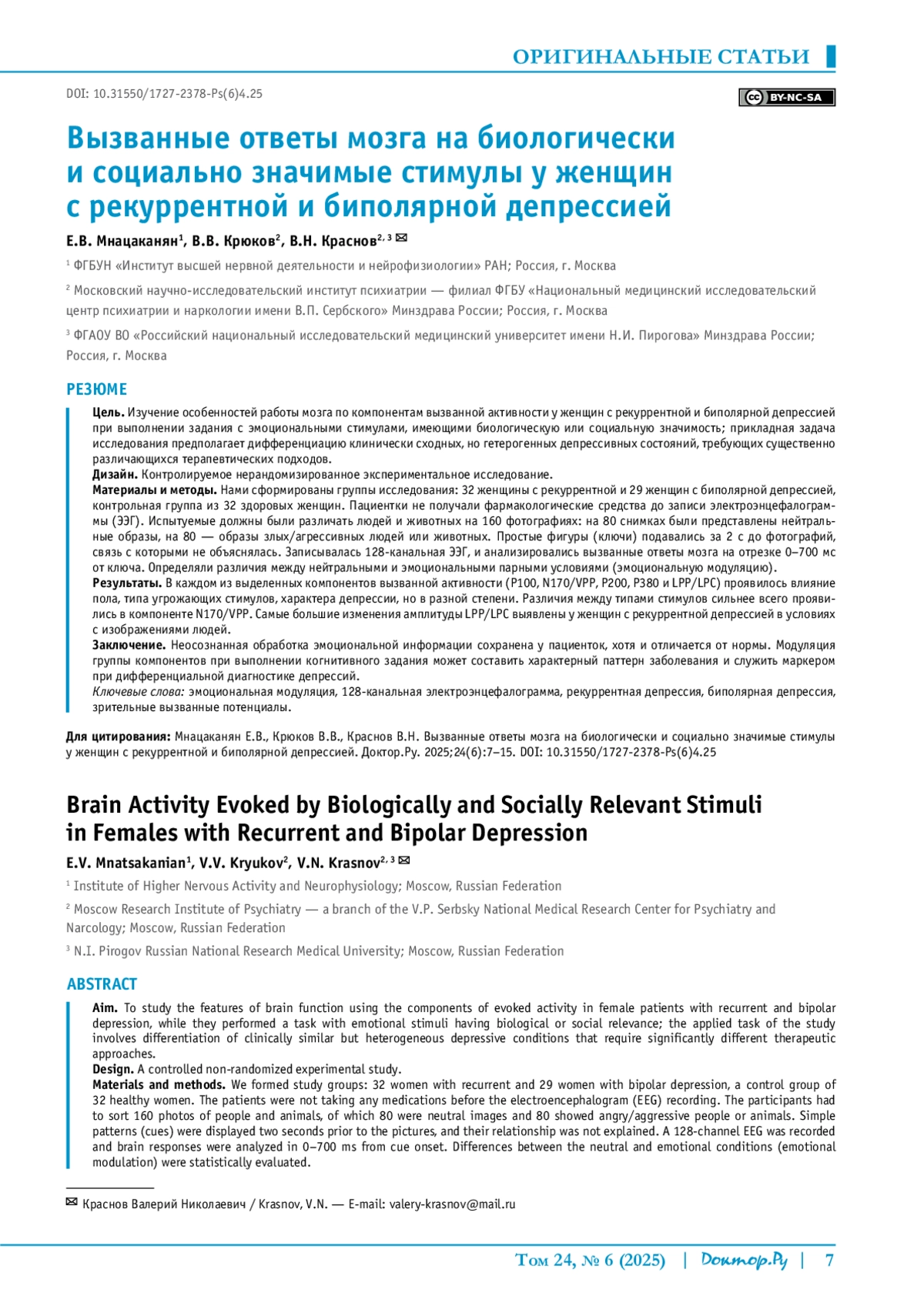 10. Мнацаканян E.B., Крюков B.B., Краснов B.H. Вызванные ответы мозга на негативные стимулы у мужчин с рекуррентной и биполярной депрессией. Доктор.Ру. 2023;22(6):28-34.