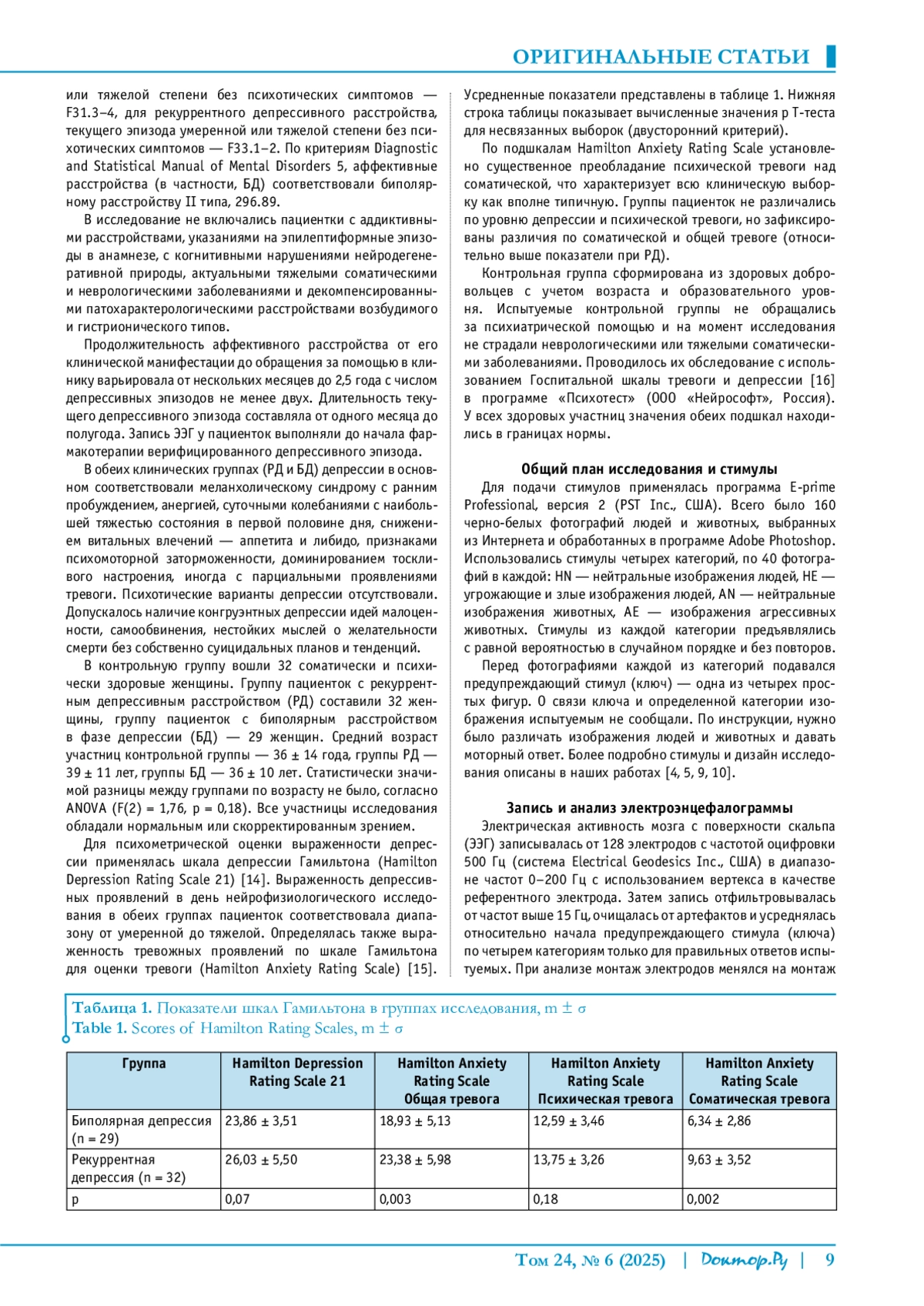 Материалы и методы. Нами сформированы группы исследования: 32 женщины с рекуррентной и 29 женщин с биполярной депрессией, контрольная группа из 32 здоровых женщин. Пациентки не получали фармакологические средства до записи электроэнцефалограммы (ЭЭГ). Испытуемые должны были различать людей и животных на 160 фотографиях: на 80 снимках были представлены нейтральные образы, на 80 — образы злых/агрессивных людей или животных. Простые фигуры (ключи) подавались за 2 с до фотографий, связь с которыми не объяснялась. Записывалась 128-канальная ЭЭГ, и анализировались вызванные ответы мозга на отрезке 0–700 мс от ключа. Определяли различия между нейтральными и эмоциональными парными условиями (эмоциональную модуляцию).