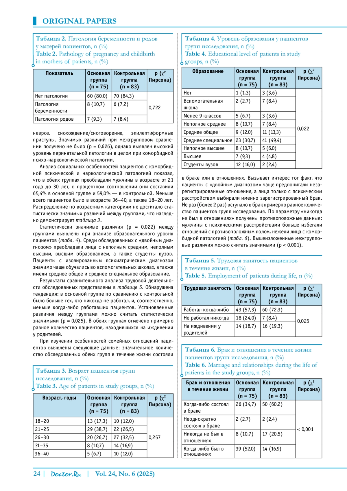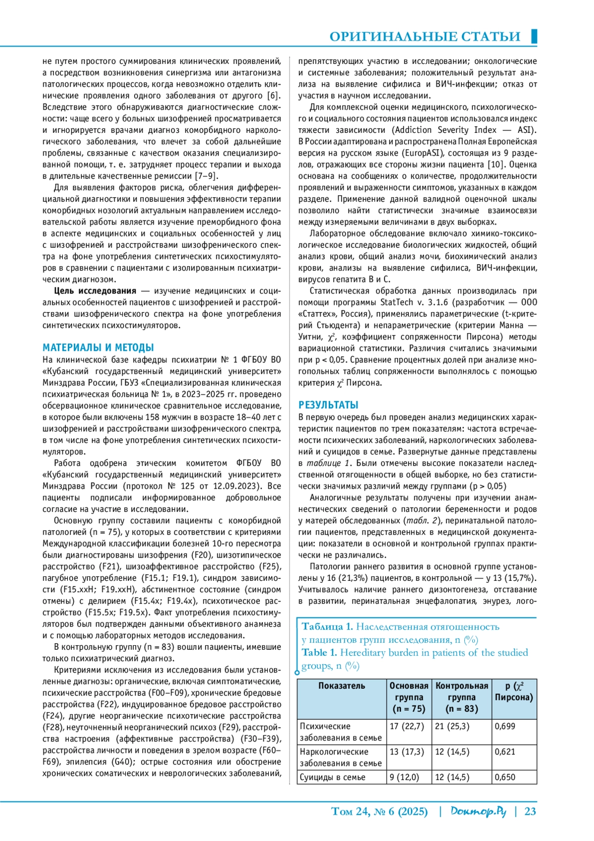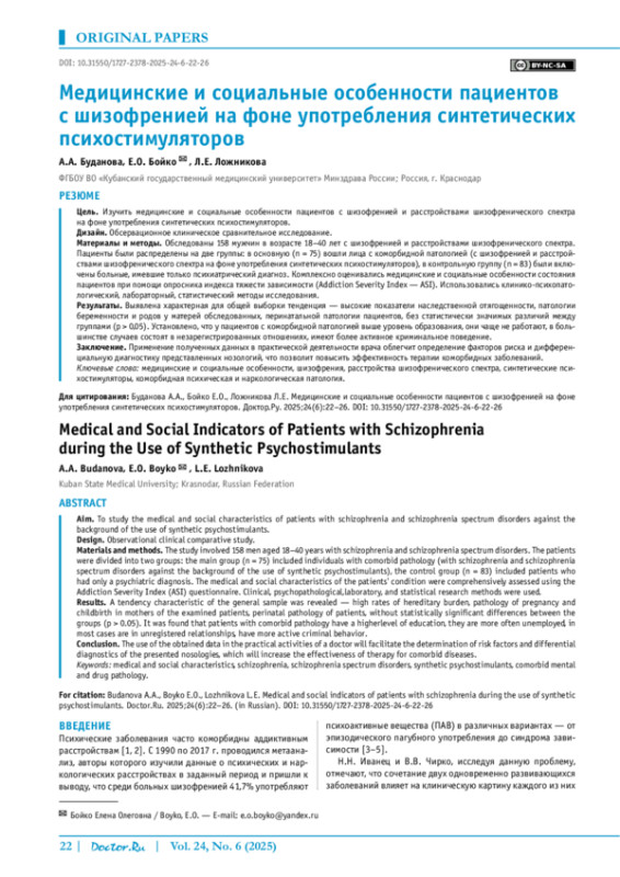 Материалы и методы. Обследованы 158 мужчин в возрасте 18–40 лет с шизофренией и расстройствами шизофренического спектра. Пациенты были распределены на две группы: в основную (n = 75) вошли лица с коморбидной патологией (с шизофренией и расстройствами шизофренического спектра на фоне употребления синтетических психостимуляторов), в контрольную группу (n = 83) были включены больные, имевшие только психиатрический диагноз. Комплексно оценивались медицинские и социальные особенности состояния пациентов при помощи опросника индекса тяжести зависимости (Addiction Severity Index — ASI). Использовались клинико-психопатологический, лабораторный, статистический методы исследования.