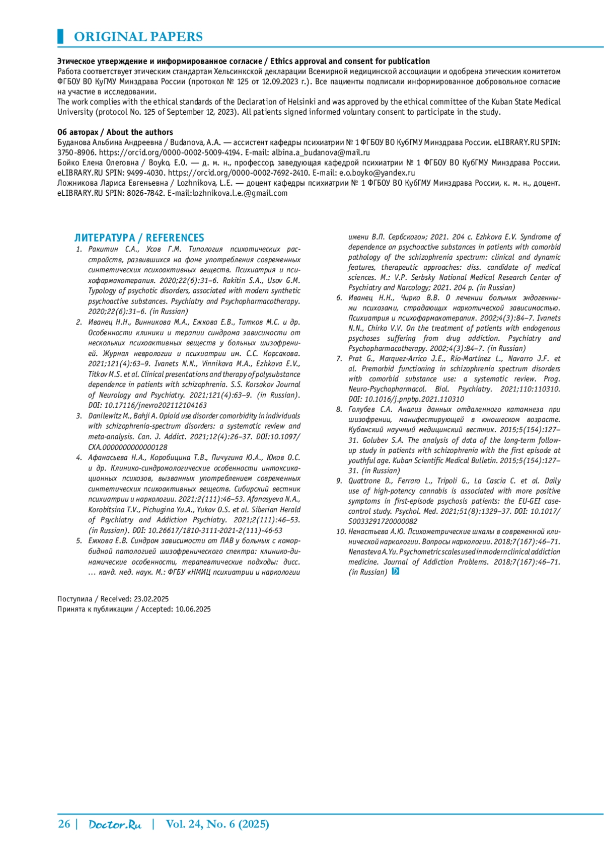 Ezhkova Е. V. Syndrome of dependence on psychoactive substances in patients with comorbid pathology of the schizophrenia spectrum: clinical and dynamic features, therapeutic approaches: diss. candidate of medical sciences. M.: V.P. Serbsky National Medical Research Center of Psychiatry and Narcology; 2021. 204 p. (in Russian).