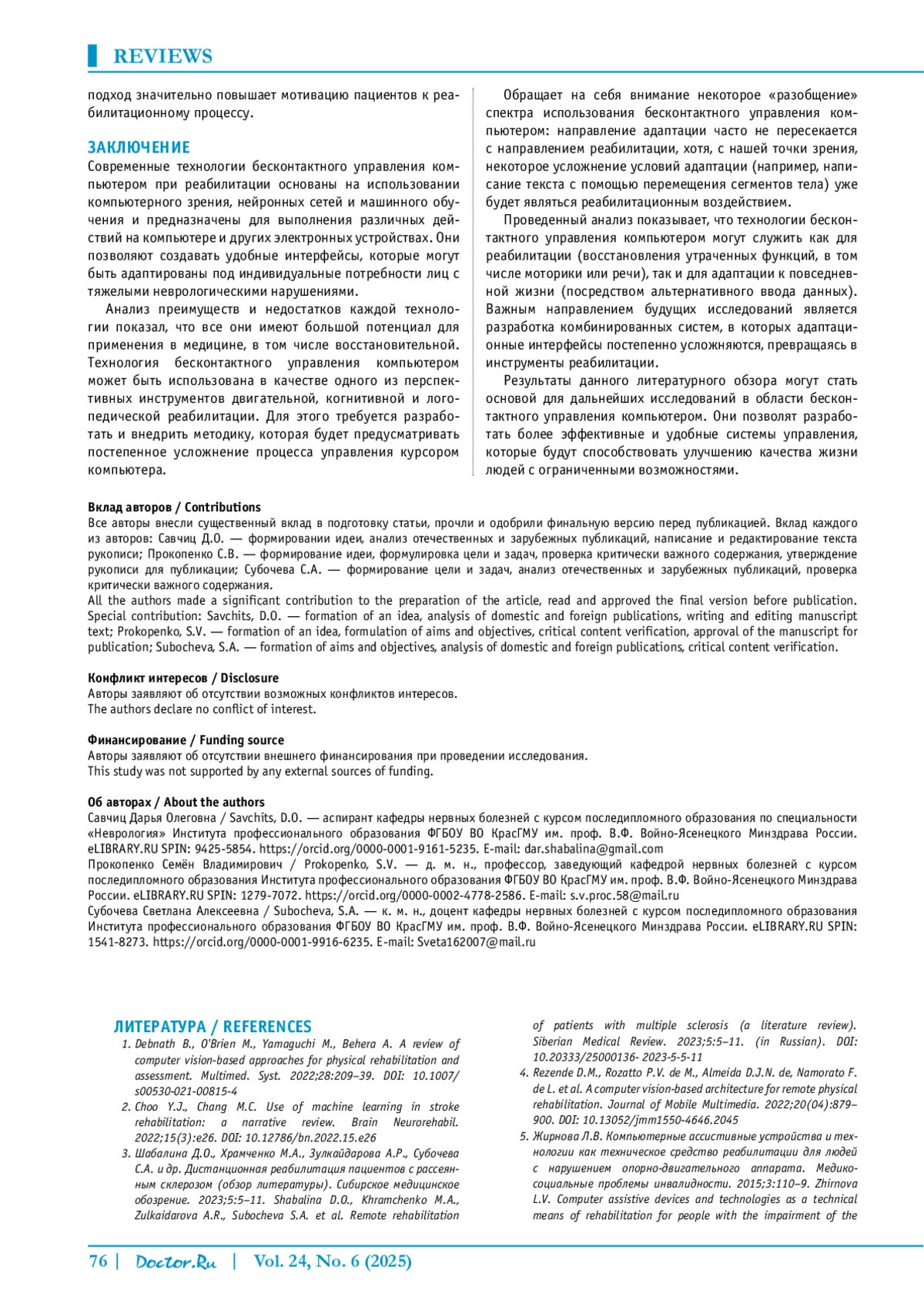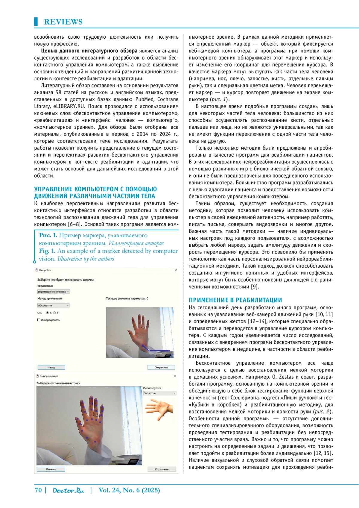 Основные положения. Внедрение компьютерных технологий в процесс восстановительного лечения — одна из ключевых задач реабилитации на сегодняшний день. К перспективным технологиям относится бесконтактное управление компьютером. Рассматривались источники из доступных баз данных (eLIBRARY. RU, PubMed, Cochrane Librare), опубликованные в период с 2014 по 2024 г. В литературном обзоре описываются основные подходы и методики, позволяющие осуществлять бесконтактное управление компьютером, особое внимание уделяется анализу преимуществ и ограничений данных методик в контексте реабилитации.