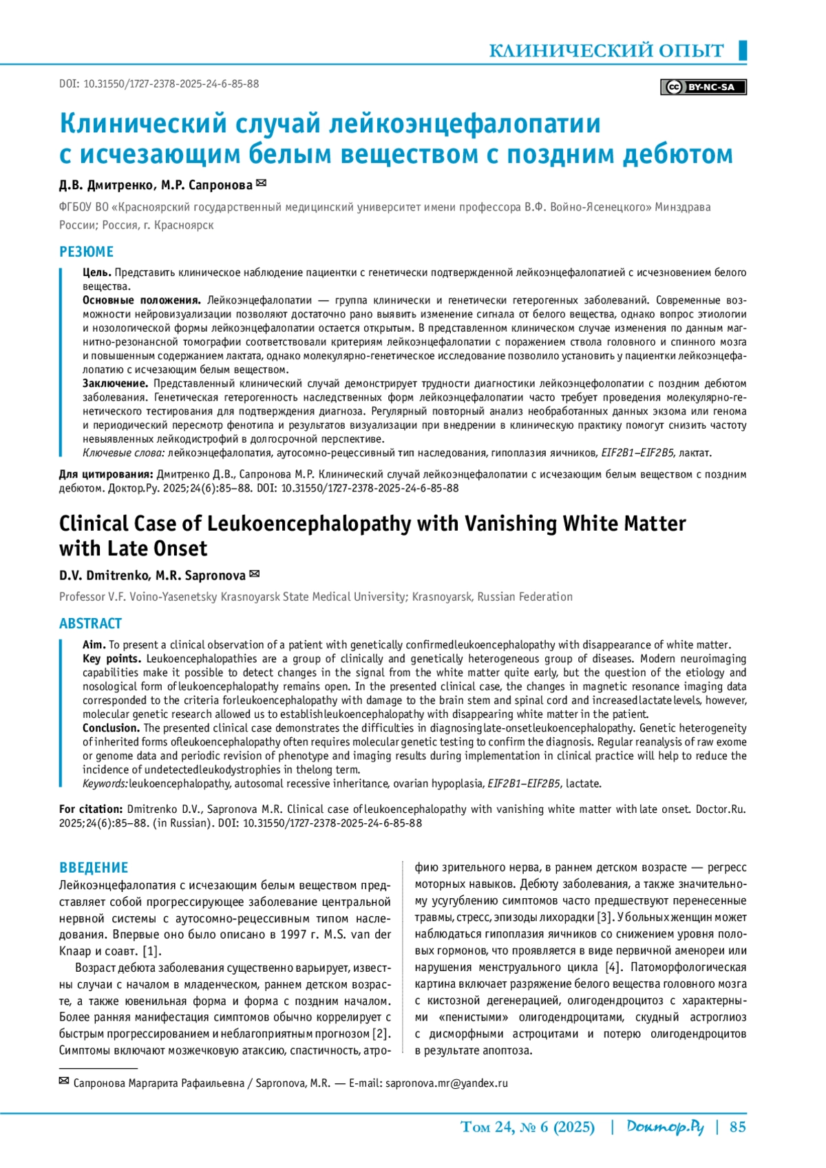 5. Bugiani A.L, Boor I., Powers J.M., Scheper G.C. et al. Leukoencephalopathy with vanishing white matter: a review. 3. Neuropathol. Exp. Neurol. 2010;69(10):987-96. 10.1097/ NEN. ObOl 3e3181f2eafa Поступила / Received: 14.05.2024 Принята к публикации / Accepted: 03.07.2024. DOI: 10.1097/NEN.ObOl3e3181f2eafa