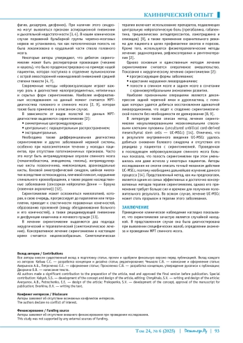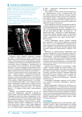 Заключение. Приведенное клиническое наблюдение наглядно показывает, что сирингомиелия зачастую является случайной находкой. В представленном случае заболевание было диагностировано при выявлении специфических жалоб, определении анамнеза и выполнении магнитно-резонансной томографии спинного мозга.