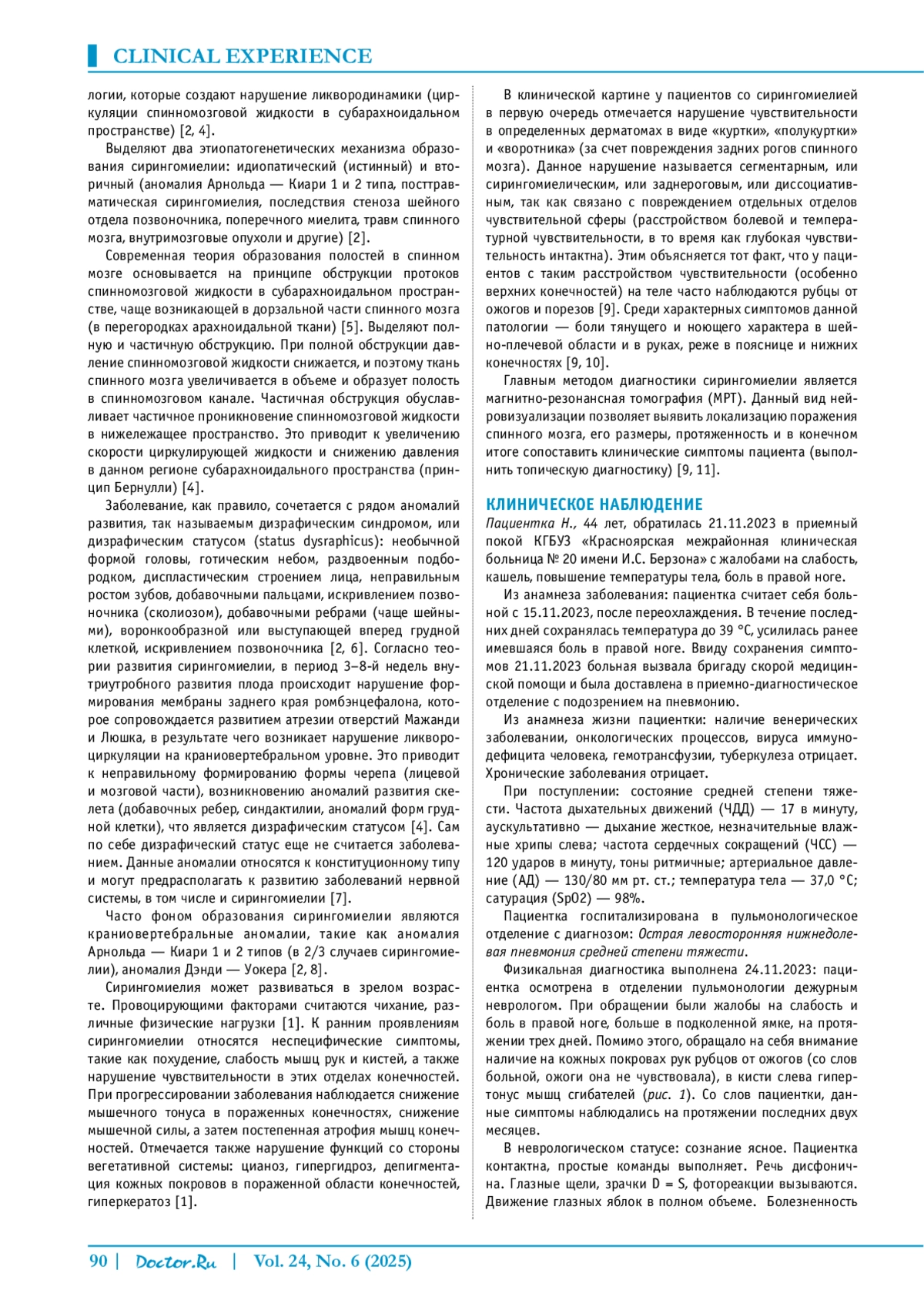 Основные положения. Сирингомиелия — хроническое прогрессирующее заболевание нервной системы, характерной особенностью которого является наличие полости в спинном мозге, диагностируемой с помощью магнитно-резонансной томографии. Для данной патологии типичны нарушение чувствительности по типу «куртки», «полукуртки» и «воротника», снижение мышечной силы в конечностях, в основном в верхних. Отмечается также дизрафический статус — дефект развития нервной трубки в ходе онтогенеза человека, при котором наблюдаются различные аномалии опорно-двигательного аппарата. Само заболевание не является летальным для человека, но на фоне таких проявлений сирингомиелии, как нарушение чувствительности (в результате чего возникают ожоги и травмы конечностей), боли в мышцах, снижение силы в конечностях, страдает качество жизни пациентов. Для лечения данной патологии центральной нервной системы применяются как консервативные, так и хирургические методы. Продемонстрирован случай диагностики сирингомиелии у пациентки пульмонологического профиля, госпитализированной с острой левосторонней нижнедолевой пневмонией средней степени тяжести.
