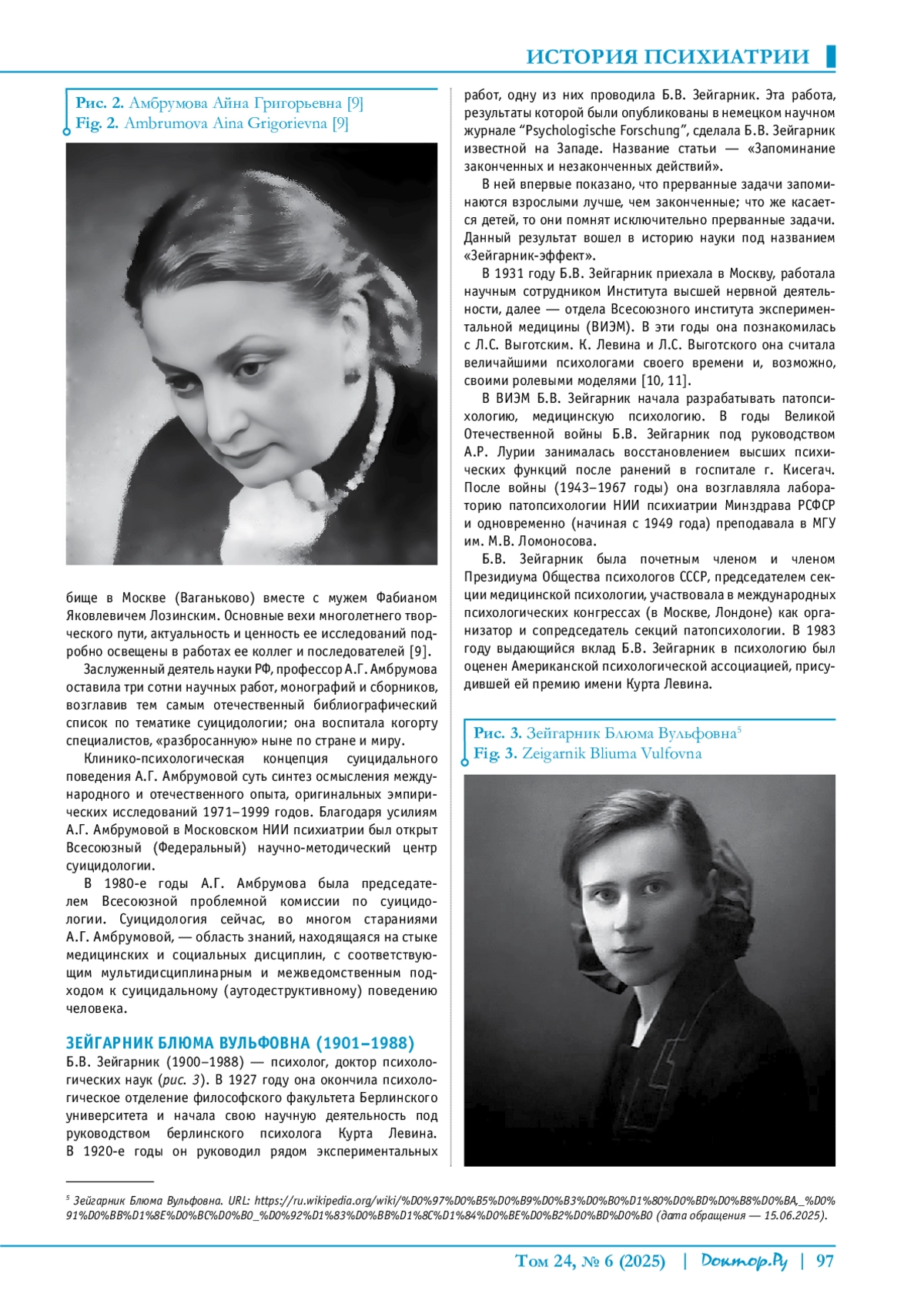 Lyubov Е.В., Tsuprun V.E. Professor Ambrumova’s era: her contribution to Russian suicidology. Medical Psychology in Russia: electronic scientific journal. 2013;2(19). (in Russian).