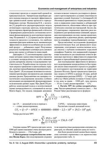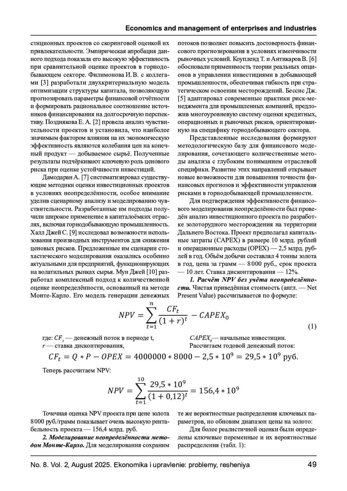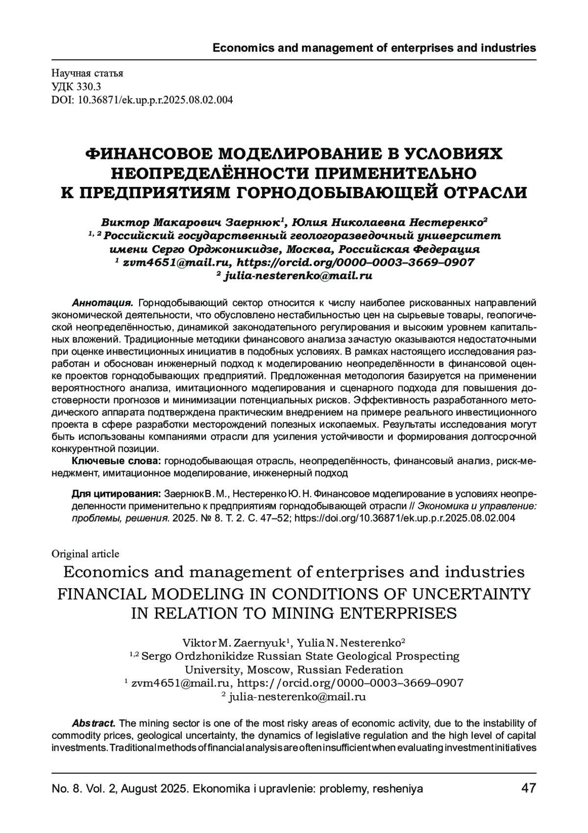 Горнодобывающий сектор относится к числу наиболее рискованных направлений экономической деятельности, что обусловлено нестабильностью цен на сырьевые товары, геологической неопределённостью, динамикой законодательного регулирования и высоким уровнем капитальных вложений. Традиционные методики финансового анализа зачастую оказываются недостаточными при оценке инвестиционных инициатив в подобных условиях. В рамках настоящего исследования разработан и обоснован инженерный подход к моделированию неопределённости в финансовой оценке проектов горнодобывающих предприятий. Предложенная методология базируется на применении вероятностного анализа, имитационного моделирования и сценарного подхода для повышения достоверности прогнозов и минимизации потенциальных рисков. Эффективность разработанного методического аппарата подтверждена практическим внедрением на примере реального инвестиционного проекта в сфере разработки месторождений полезных ископаемых. Результаты исследования могут быть использованы компаниями отрасли для усиления устойчивости и формирования долгосрочной конкурентной позиции.