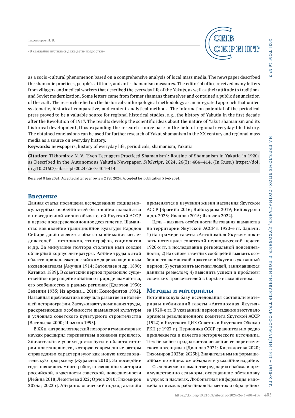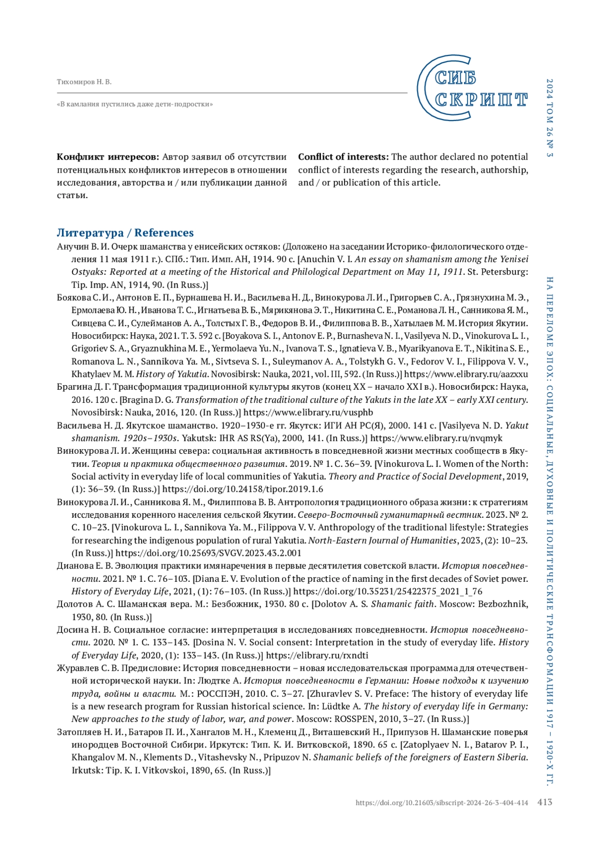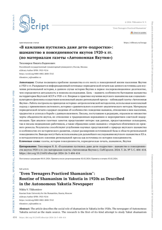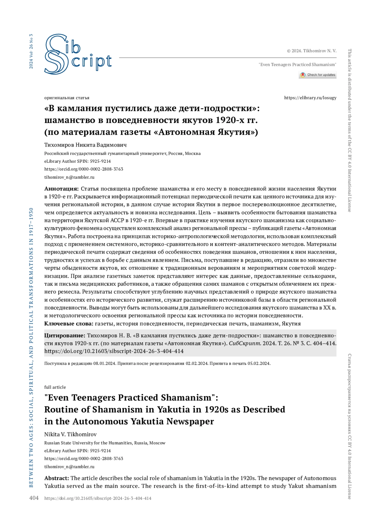 ТИХОМИРОВ Н. В. «В КАМЛАНИЯ ПУСТИЛИСЬ ДАЖЕ ДЕТИ-ПОДРОСТКИ»: ШАМАНСТВО В ПОВСЕДНЕВНОСТИ ЯКУТОВ 1920-Х ГГ. (ПО МАТЕРИАЛАМ ГАЗЕТЫ «АВТОНОМНАЯ ЯКУТИЯ») // СИБСКРИПТ. 2025. ТОМ 27, №3
