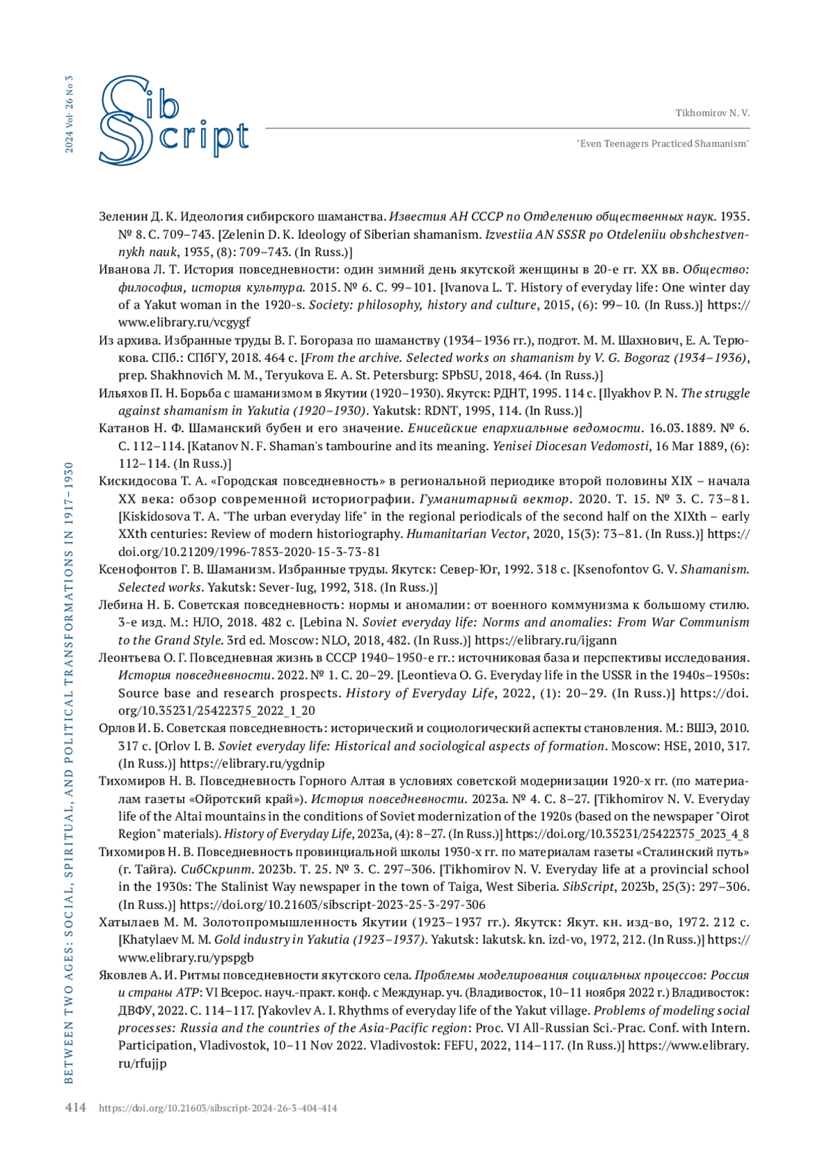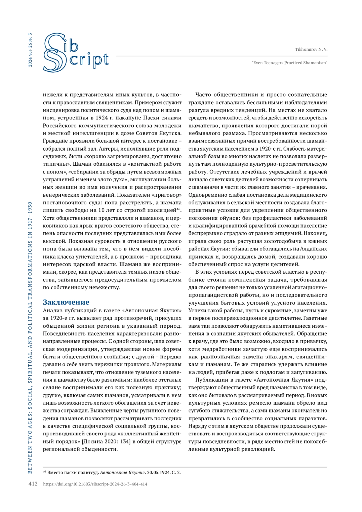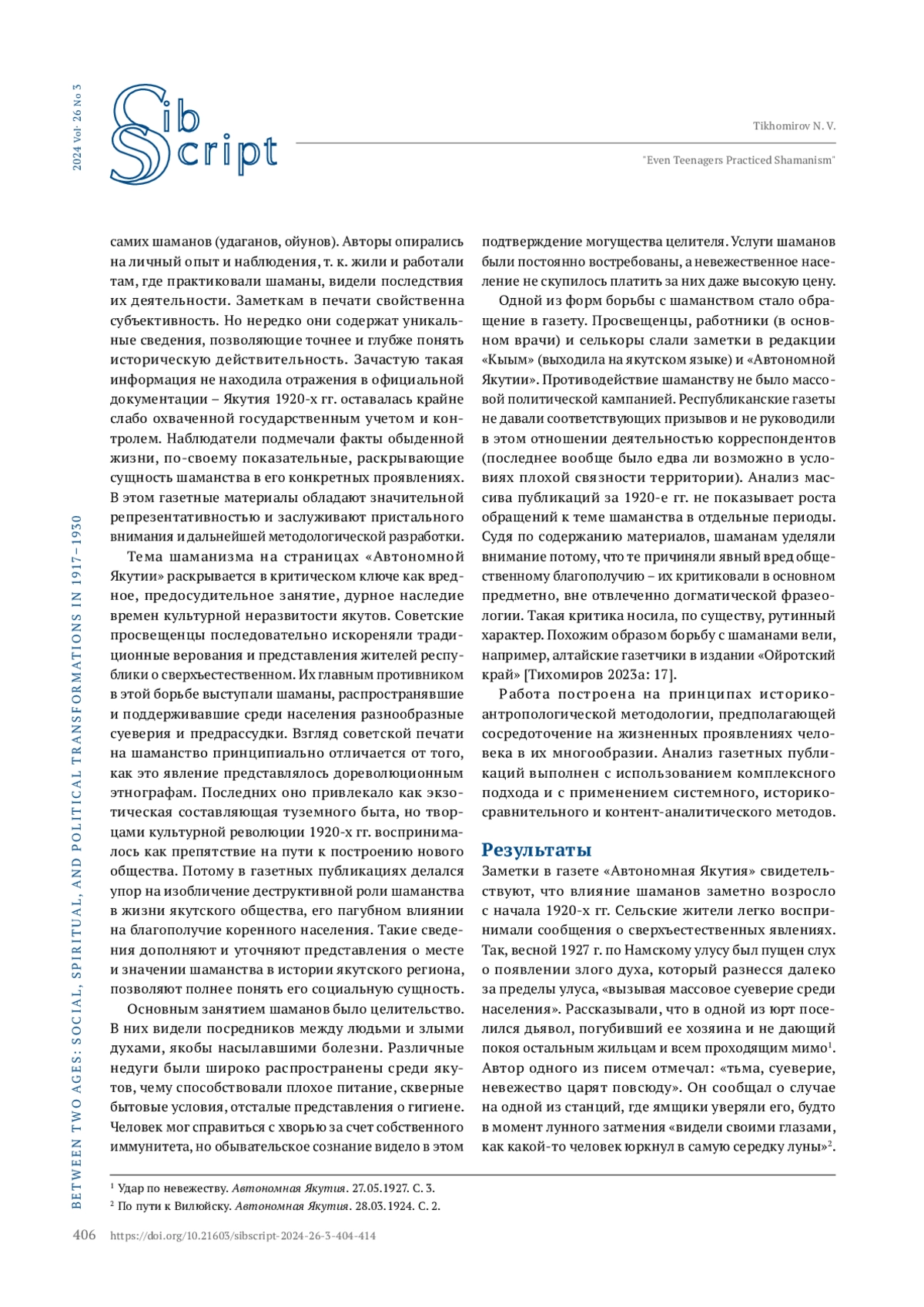 ТИХОМИРОВ Н. В. «В КАМЛАНИЯ ПУСТИЛИСЬ ДАЖЕ ДЕТИ-ПОДРОСТКИ»: ШАМАНСТВО В ПОВСЕДНЕВНОСТИ ЯКУТОВ 1920-Х ГГ. (ПО МАТЕРИАЛАМ ГАЗЕТЫ «АВТОНОМНАЯ ЯКУТИЯ») // СИБСКРИПТ. 2025. ТОМ 27, №3