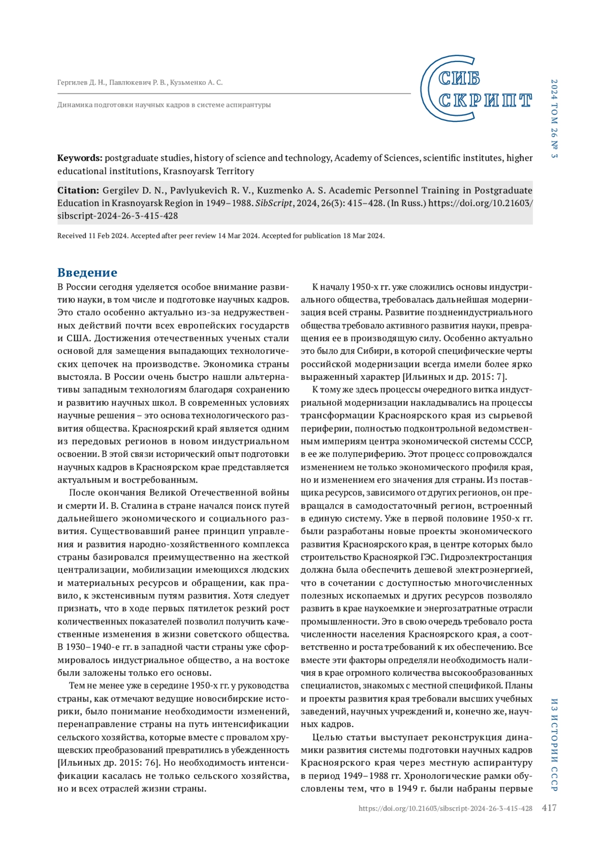 С переходом общества на постиндустриальную фазу развития происходит повышение роли и значения науки и образования, в этих условиях важно учитывать опыт прошлого. Во второй половине ХХ в. Красноярский край проходил двойной переход. С одной стороны, он переживал очередной виток индустриальной модернизации, с другой – под влияниями различных факторов превращался из ресурсной периферии в развитый полупериферийный район советской экономической системы. Важным элементом обоих переходов выступало развитие местной системы подготовки кадров науки и высшей школы. До 1949 г. в Красноярском крае отсутствовала собственная база подготовки аспирантов. Цель данной статьи – реконструкция динамики развития системы аспирантской подготовки в 1949–1988 гг. Выбранные хронологические рамки обусловлены первым набором аспирантов в крае и одними из последних наборов, осуществленных в Советскую эпоху. С начала 1950-х гг. здесь происходит формирование новых вузов и научных учреждений с собственной программой подготовки высших кадров науки. Фактически ранее не делалось попыток дать комплексный анализ количественных характеристик подготовки аспирантов в регионе. Методологической основой исследования выступает симбиоз адаптированного мир-системного подхода и модернизационной теории, позволивший проанализировать значения количественных изменений в системе аспирантуры края за сорокалетний период в рамках процессов развития самого региона. Экономические нужды и народно-хозяйственный профиль Красноярского края в условиях позднеиндустриальной модернизации потребовали роста количества научных кадров, обеспечивающих попытки перехода на интенсивный путь развития. В результате материалы показали, что с 1949 г. до конца 1960-х гг. рост числа аспирантов в крае превысил 9000 %, после чего дальнейшие показатели набора и выпуска стабилизировались. Одновременно с этим происходили изменения и самой системы подготовки, росло число специальностей. Набор направлений подготовки и их пропорции в первую очередь были обусловлены планами хозяйственного освоения региона. Достижение пиковых показателей численности аспирантов совпадало с завершением формирования новой индустриальной базы хозяйственного освоения и развития региона. Край из периферии превращался в полупериферию экономической системы СССР. Развитие системы аспирантуры Красноярского края в рассматриваемые годы было отражением экономического профиля региона. Наибольшую долю в разрезе специальностей подготовки аспирантуры составляли точные и естественные науки. Более трети от всех прошедших в Красноярском крае аспирантов готовились по техническим специальностям, следом шли физико-математические и сельскохозяйственные науки. Рост численности подготовки по этим направлениям продолжался вплоть до конца 1960-х гг., после чего динамика их численности начала даже несколько падать на фоне роста численности аспирантов по социально ориентированным наукам. Это в свою очередь было отражением изменений в экономическом и социальном развитии Красноярского края.