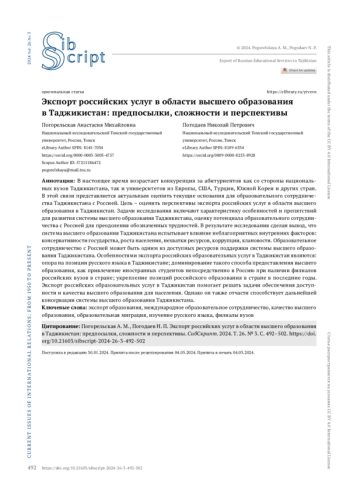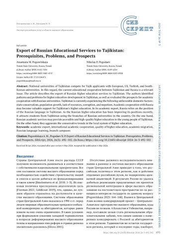 В настоящее время возрастает конкуренция за абитуриентов как со стороны национальных вузов Таджикистана, так и университетов из Европы, США, Турции, Южной Кореи и других стран. В этой связи представляется актуальным оценить текущие основания для образовательного сотрудничества Таджикистана с Россией. Цель – оценить перспективы экспорта российских услуг в области высшего образования в Таджикистан. Задачи исследования включают характеристику особенностей и препятствий для развития системы высшего образования Таджикистана, оценку потенциала образовательного сотрудничества с Россией для преодоления обозначенных трудностей. В результате исследования сделан вывод, что система высшего образования Таджикистана испытывает влияние неблагоприятных внутренних факторов: консервативности государства, роста населения, нехватки ресурсов, коррупции, клановости. Образовательное сотрудничество с Россией может быть одним из доступных ресурсов поддержки системы высшего образования Таджикистана. Особенностями экспорта российских образовательных услуг в Таджикистан являются: опора на позиции русского языка в Таджикистане; доминирование такого способа предоставления высшего образования, как привлечение иностранных студентов непосредственно в Россию при наличии филиалов российских вузов в стране; укрепление позиций российского образования в стране в последние годы. Экспорт российских образовательных услуг в Таджикистан помогает решать задачи обеспечения доступности и качества высшего образования для населения. Однако он также отчасти способствует дальнейшей консервации системы высшего образования Таджикистана.