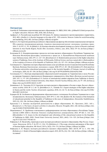 10. Мирошников С. Н. Проблемы становления и реформирования системы образования в Республике Таджикистан в 2000-2020 гг. Вестник Томского государственного университета. 2021. № 465. С. 116-123. https://doi.org/10.17223/15617793/465/16