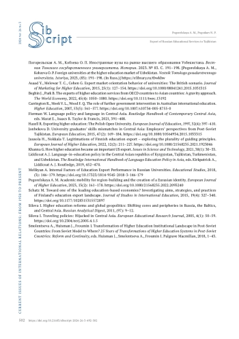 13. Погорельская А. М., Кобзева О. П. Иностранные вузы на рынке высшего образования Узбекистана. Вестник Томского государственного университета. История. 2023. № 83. С. 191-198. https://elibrary.ru/tbwkhw