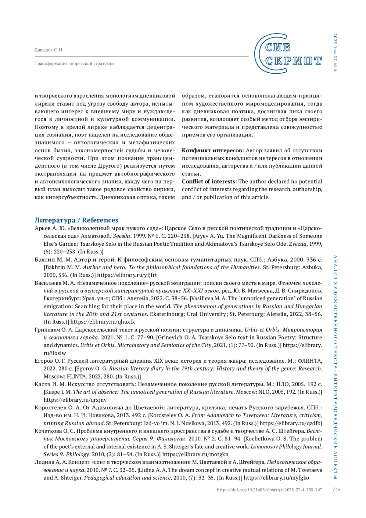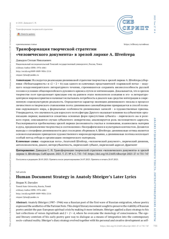 Исследуется реализация дневниковой стратегии творчества в зрелой лирике А. Штейгера (сбор ники «Неблагодарность» и «2 × 2 = 4») как одного из ключевых представителей «парижской ноты» – ведущего младоэмигрантского литературного течения, стремившегося сохранить жизнеспособность русской поэзии в условиях общеевропейского духовного кризиса путем ее интимизации. Доказывается, что в зрелом творчестве поэт преодолевает присущие ему на раннем этапе монологизм сознания и эго- и литературоцентризм мировосприятия и начинает испытывать потребность в диалоге как средстве интеграции в современную социокультурную реальность. Определяется характер эволюции дневникового письма в процессе личностного и творческого становления поэта: дневниковое самонаблюдение превращается в способ познания окружающего мира, а формальные особенности дневниковых записей – в художественные приемы. Утверждается, что значимость для взрослого поэта фигуры Другого оказывает влияние на субъектную организацию лирики; выявляется семантика основных форм присутствия субъекта – лирического мы и ролевого героя; описываются случаи субъектного синкретизма; анализируется роль эксплицитного адресата. Рассматривается проблематика зрелой лирики (возможность счастья и понимания, взаимосвязь материи и духа, предназначение творчества) в соотношении с биографическим и культурным контекстом. Делаются выводы о специфике дневниковости двух последних сборников А. Штейгера: дневниковая оптика является основополагающим принципом художественного миромоделирования, а дневниковая поэтика воплощает особый метод отбора и организации эмпирического материала.