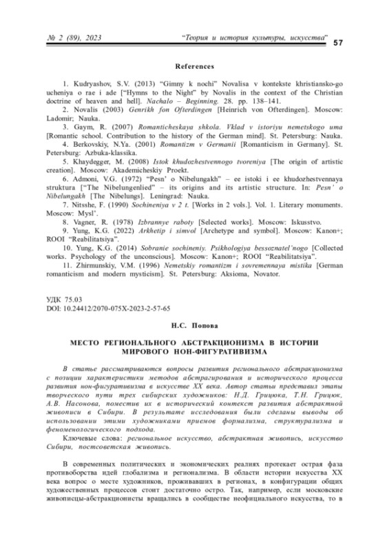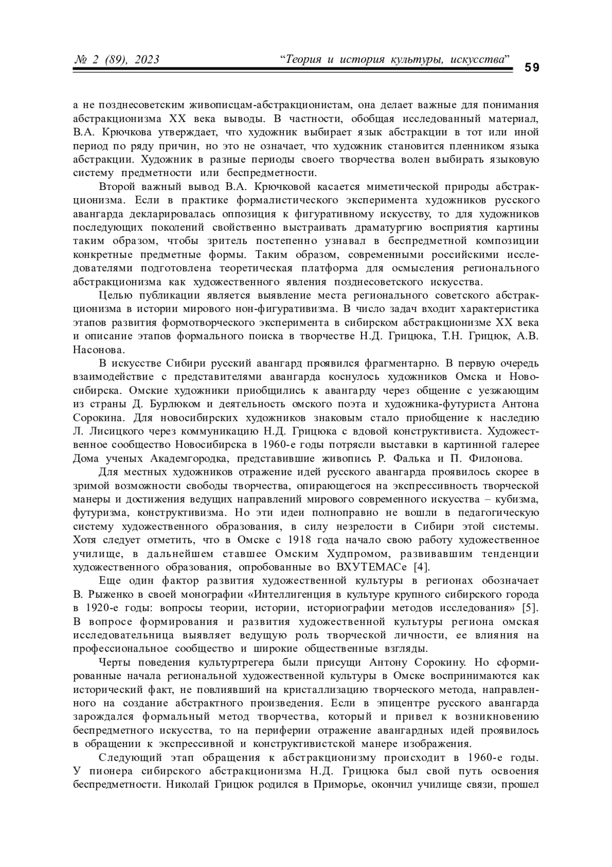 В статье рассматриваются вопросы развития регионального абстракционизма с позиции характеристики методов абстрагирования и исторического процесса развития нон-фигуративизма в искусстве ХХ века. Автор статьи представил этапы творческого пути трех сибирских художников: Н. Д. Грицюка, Т. Н. Грицюк, А. В. Насонова, поместив их в исторический контекст развития абстрактной живописи в Сибири. В результате исследования были сделаны выводы об использовании этими художниками приемов формализма, структурализма и феноменологического подхода.