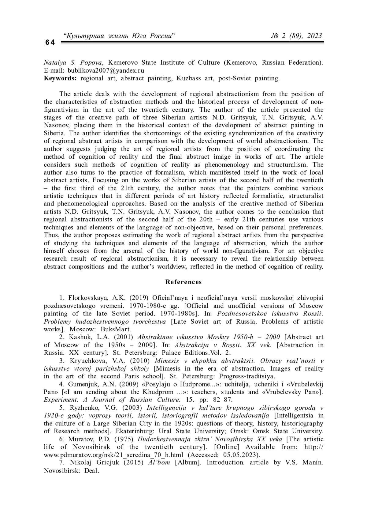 6. Муратов П.Д. Художественная жизнь Новосибирска ХХ века. URL: http://www.pdmuratov.org/nsk/21_seredina_70_h.html (дата обращения 05.05.2023).