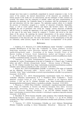 1. Голубева Е.В., Морозова Е.В. Модификация сказки “Золушка” в различных странах // Известия Самарского научного центра Российской академии наук. Социальные, гуманитарные, медико-биологические науки. 2020. №72. С. 87-90.URL: https://cyberleninka.ru/article/n/modifikatsiya-skazki-zolushka-v-razlichnyh-stranah (дата обращения: 22.02.2023). EDN: QVXXWU