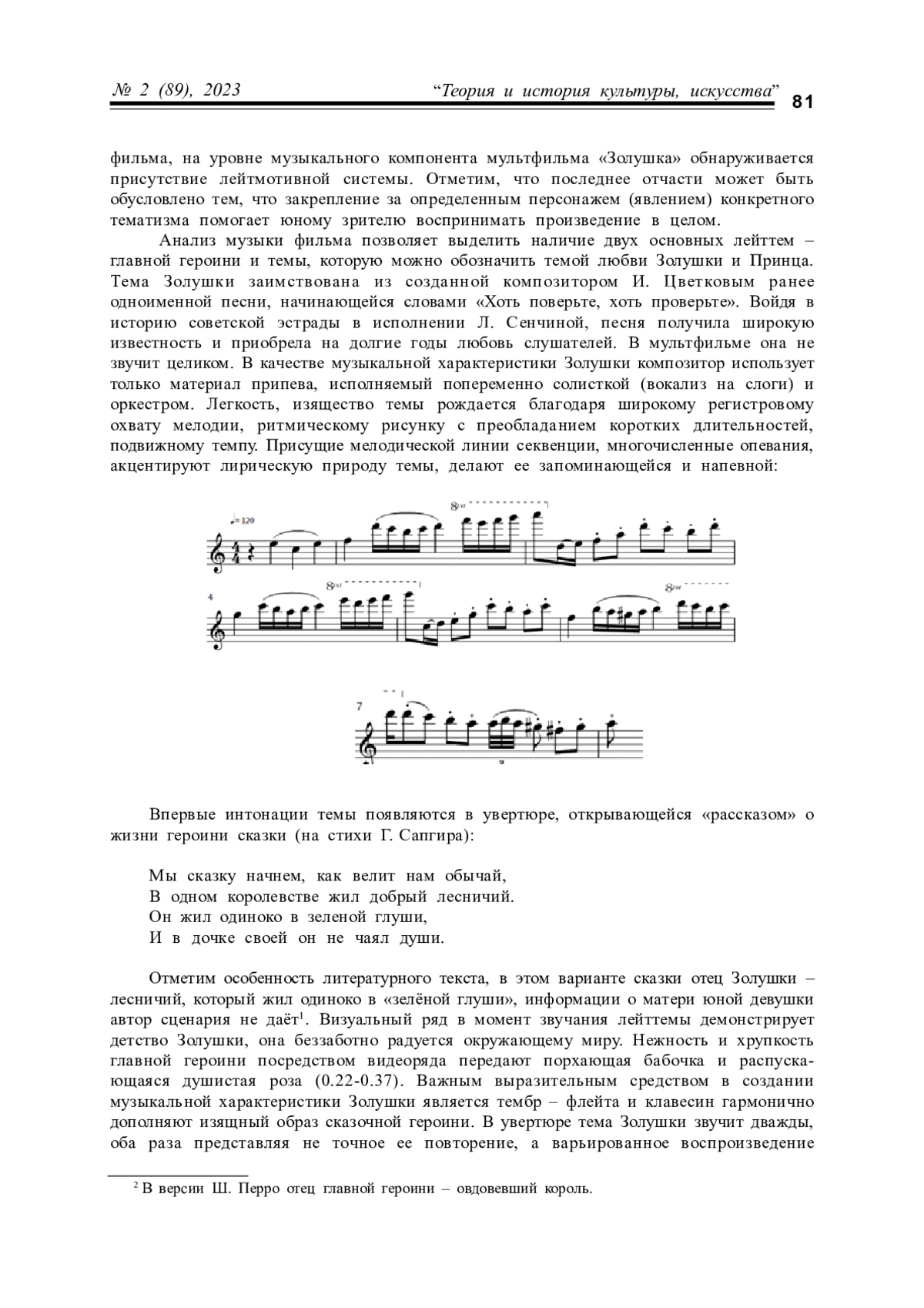 «Золушка» принадлежит к числу самых популярных сказочных сюжетов в мировой культуре. Существуя в разных литературных версиях, на протяжении длительного времени, в разные эпохи она привлекала и продолжает привлекать внимание композиторов, кинематографистов, режиссеров-постановщиков. Вопросы бытования и трактовки сюжета (от происхождения до его трансформации) нашли неоднократное осмысление в научной литературе [1, 2, 3, 4, 5, 6, 7]. Вместе с тем практически не затронутой исследователями остается проблема музыкальной интерпретации сказки в ее экранных версиях